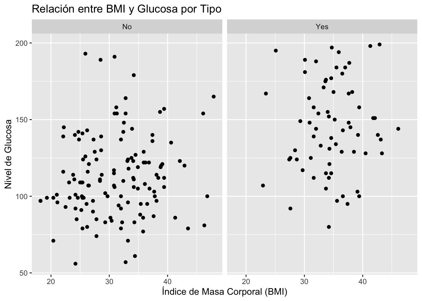 labs(title = "Relación entre BMI y Glucosa por Tipo", # Cambiar títulos
