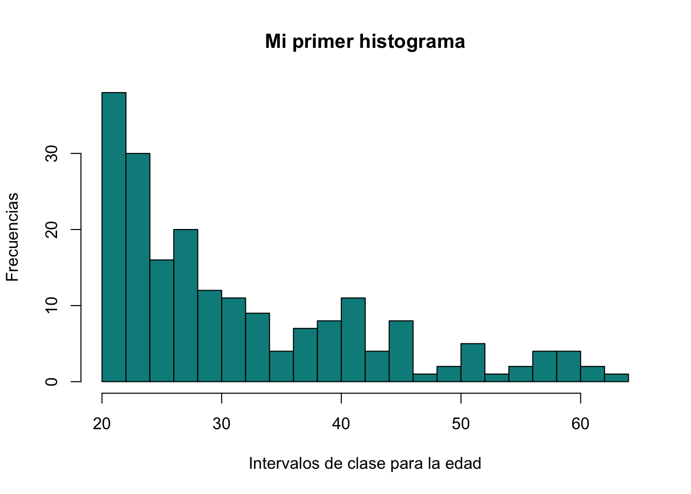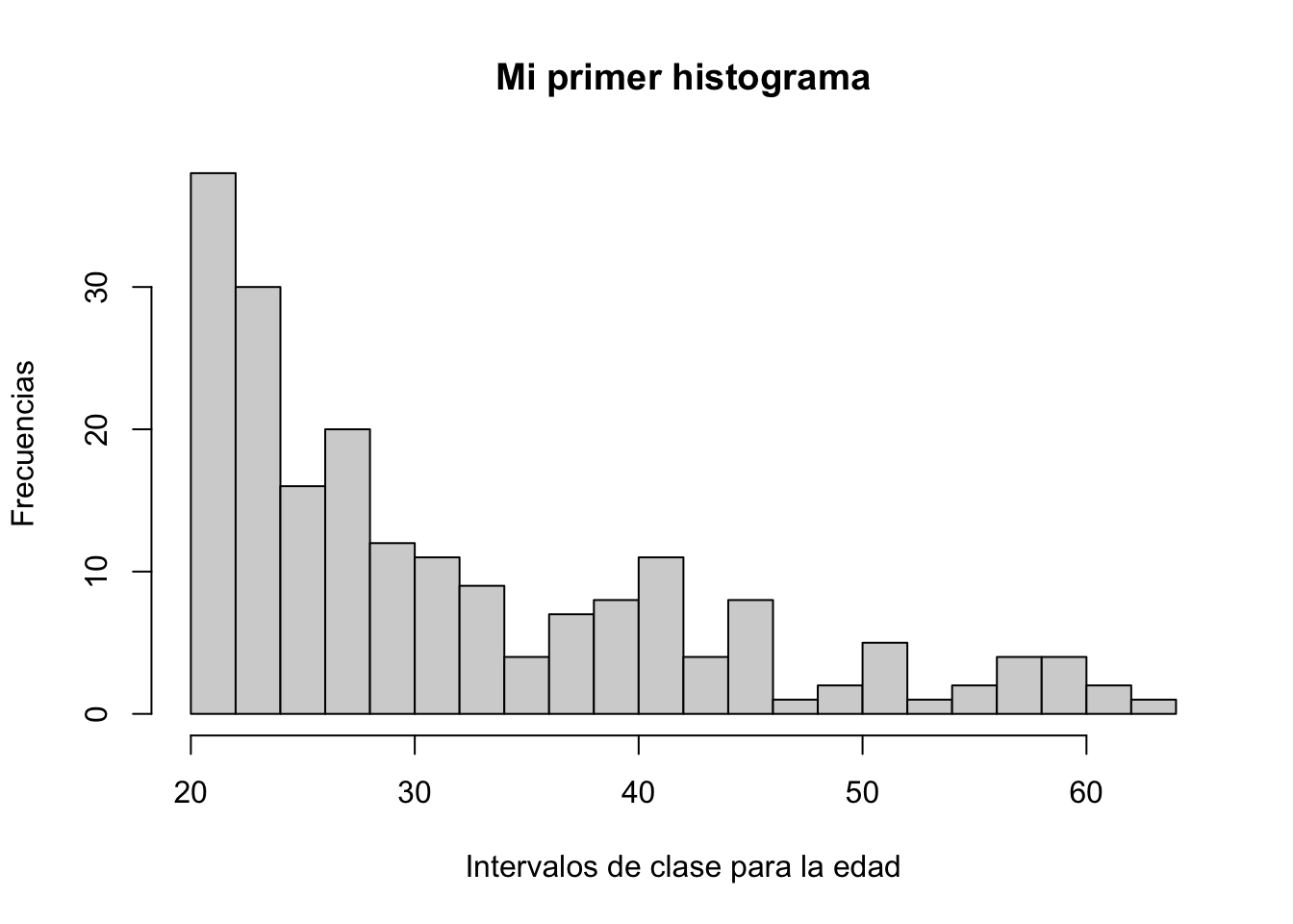 hist(Pima.tr$age, breaks = 20, main = "Mi primer histograma",