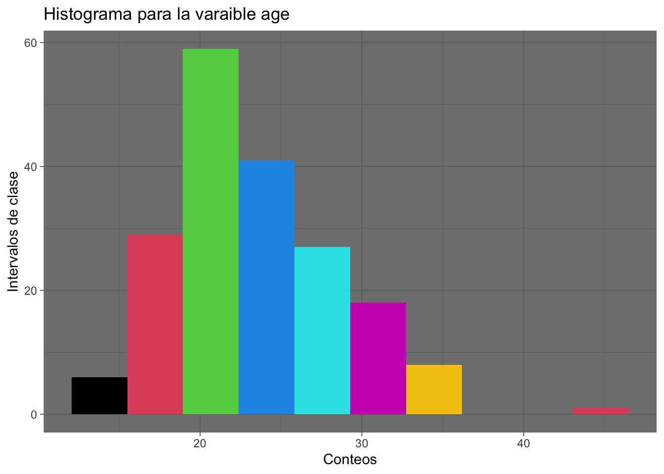 Ejercicio 8.1 Utilizando la base de datos base de datos birtwht de la librería MASSS realice un histograma con 10 intervalos de clase para la variable age. Cambie el color de las barras, agregue un título y rótulos en los ejes.