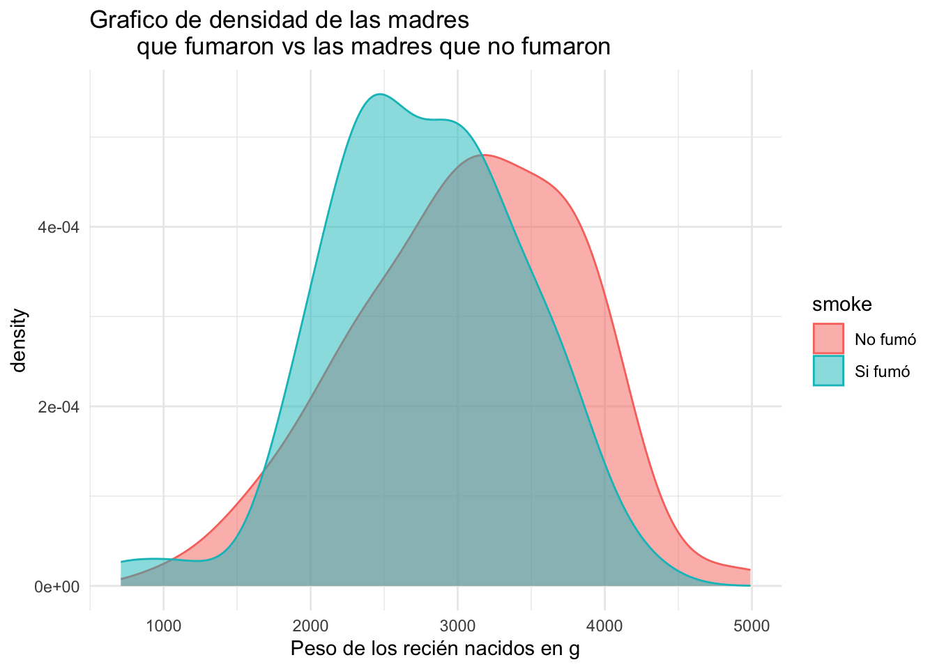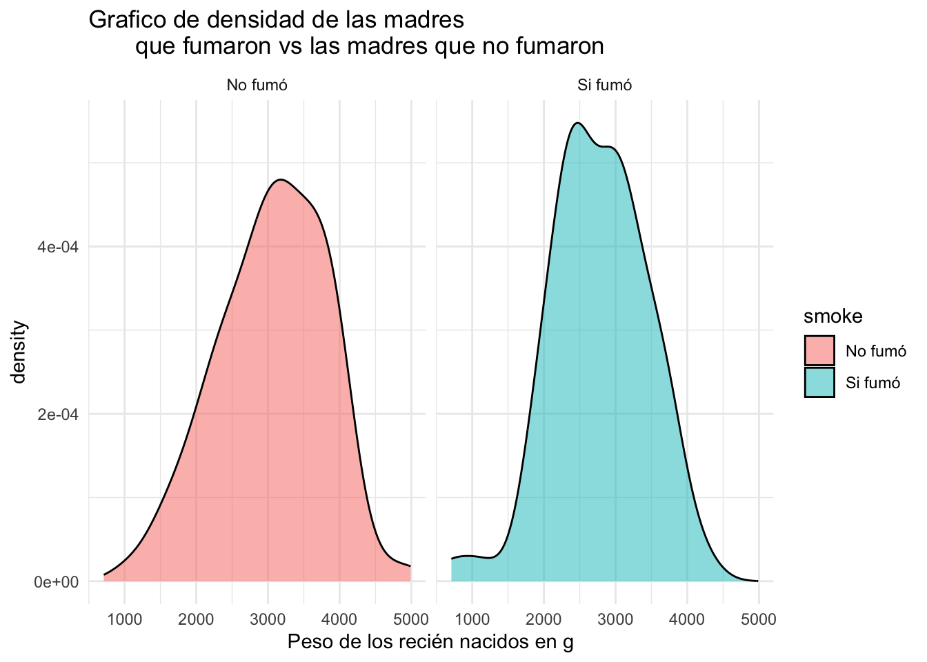 Ejercicio 8.4 Utilizando ggplot2 genere dos gráficos de densidad para la variable bwt (peso de los recién nacidos en g) de la base de datos birthwt separando a la madres que fumaron y las que no fumaron en el embarazo (variable somke). Uno de los gráficos deberá de hacer la división utilizando aes y otro mediante la capa faceta.