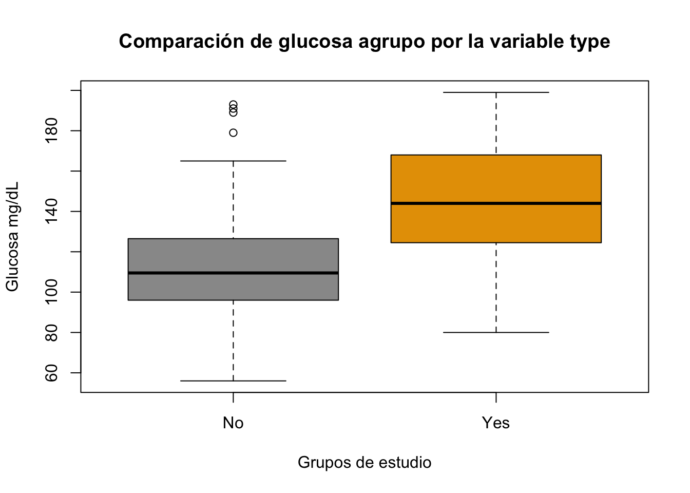 Vamos a ahora a crear un gráfico de boxplot para las concentraciones de glucosa (glu) separado por las mujeres con y sin diabetes, del Dataframe Pima.tr