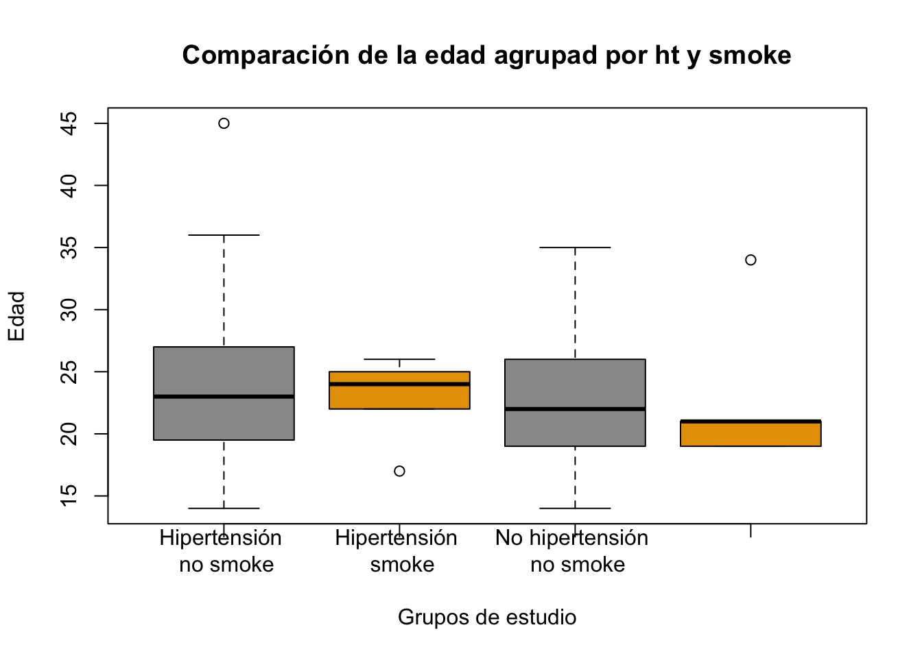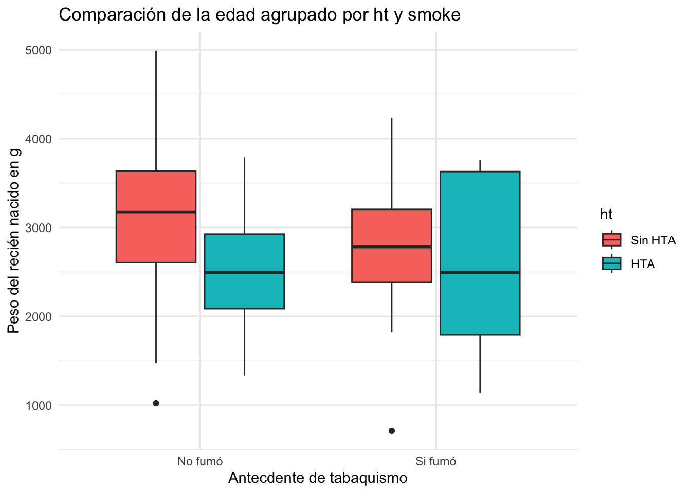 ::: {.Exercise #exr-7_14}} Utilizando la base birthwt realice un boxplot en el que agrupe la edad de la madre (age) de acuerdo al antecedente de hipertensión (ht) y el antecedente de tabaquismo de la madre (smoke). :::