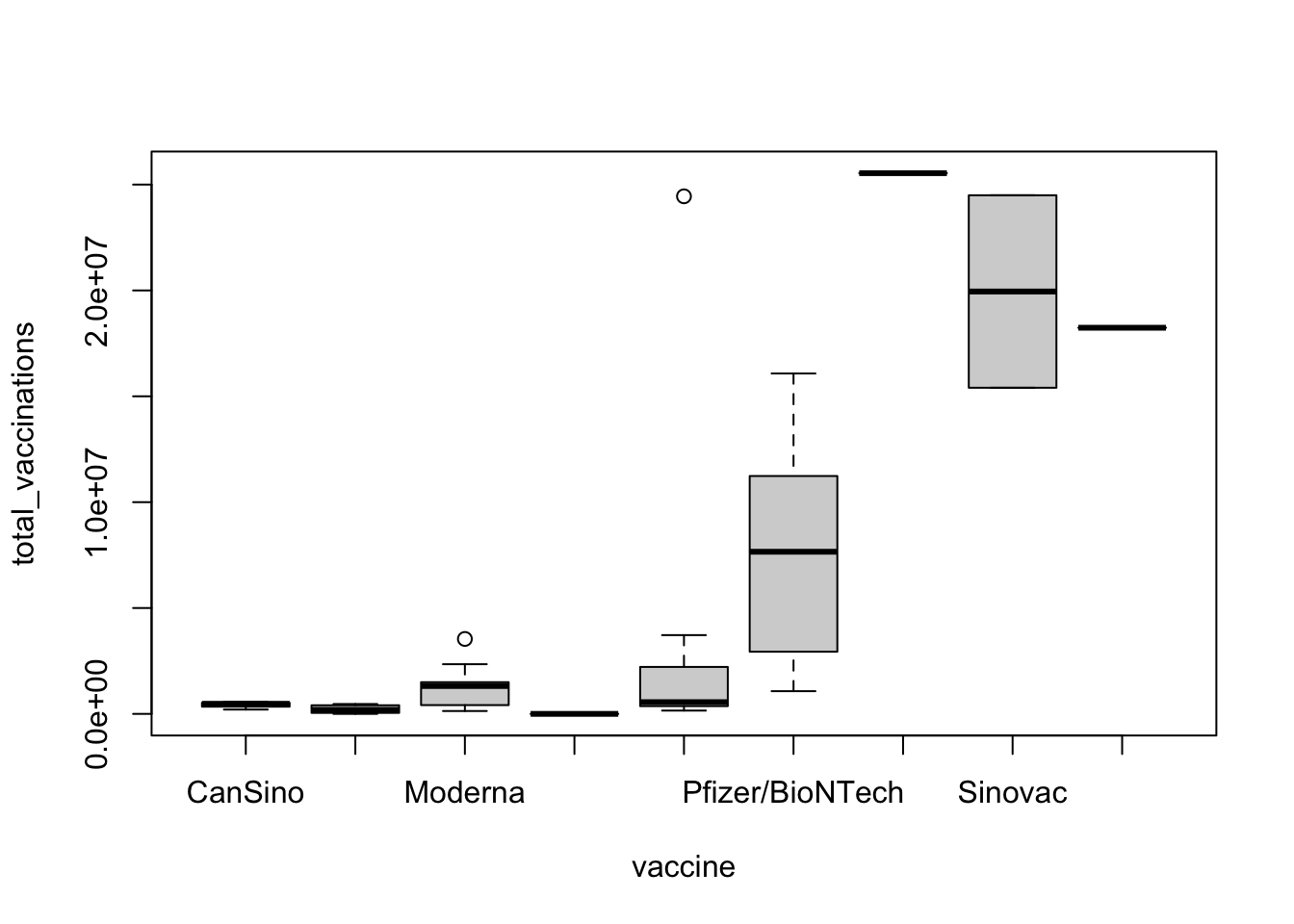 Ejercicio 8.7 Utilizando la base de datos vacunacion seleccione las primeras 50 filas para realizar un boxplot del total de pacientes total_vaccinations vacunados agrupado por el tipo de vacuna vaccine. ¿Tiene sentido hacer esta gráfica?
