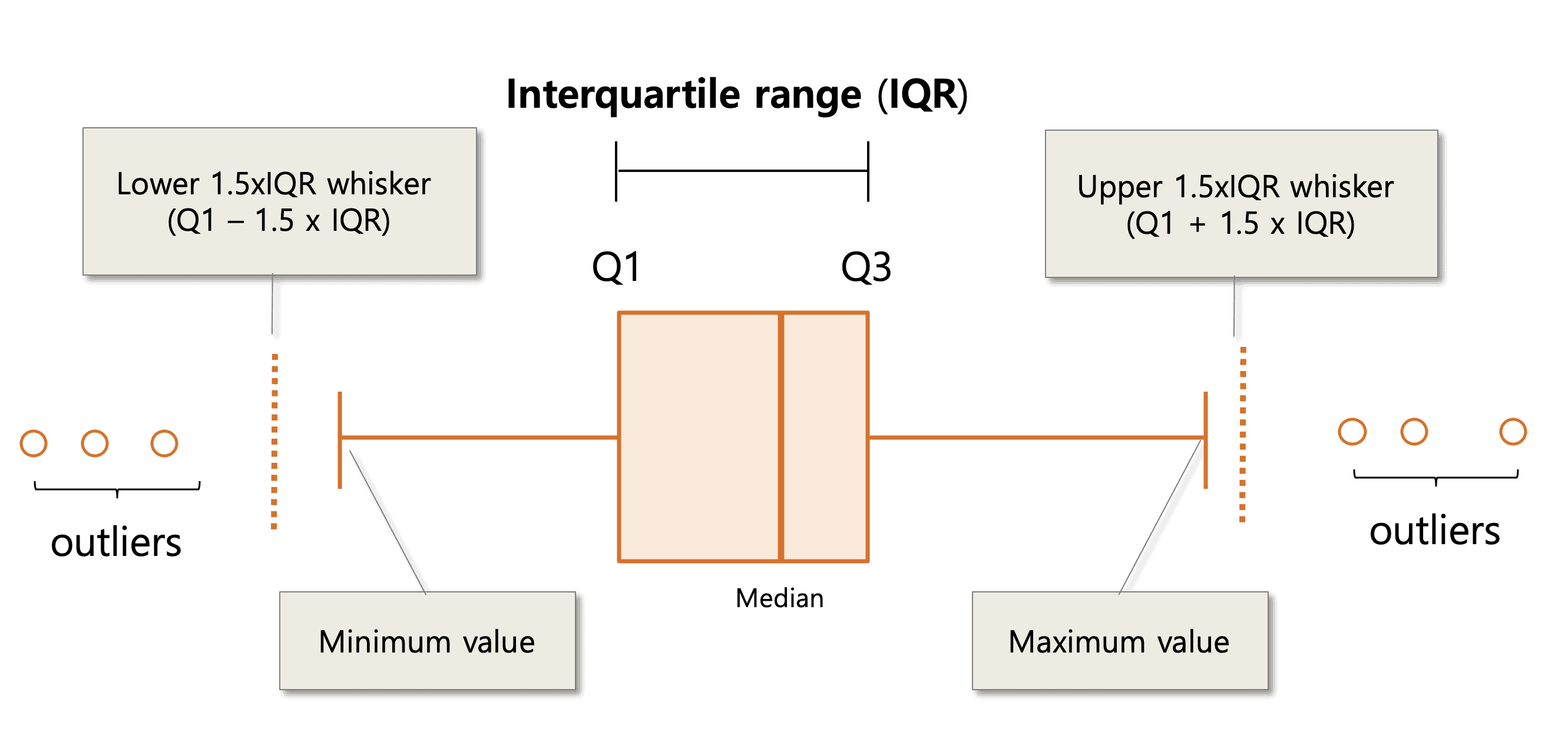 La (fig_7_2?) muestra un ejemplo clásico de un boxplot. En un boxplot, la caja representa el rango intercuartil, la linea del centro del representa la mediana y los bordes de la caja representan el Q1 y Q3. Los bigotes representan el valor mínimo y máximo teórico, estos valores teóricos son los valores más pequeños y más grandes dentro de 1.5 veces el rango intercuartílico (1.5 * IQR) desde los cuartiles Q1 y Q3, respectivamente. Los puntos representan los outliers. Indican observaciones que son significativamente diferentes del resto de los datos y que se encuentran a 1.5 veces el IQR del Q1 o del Q3.