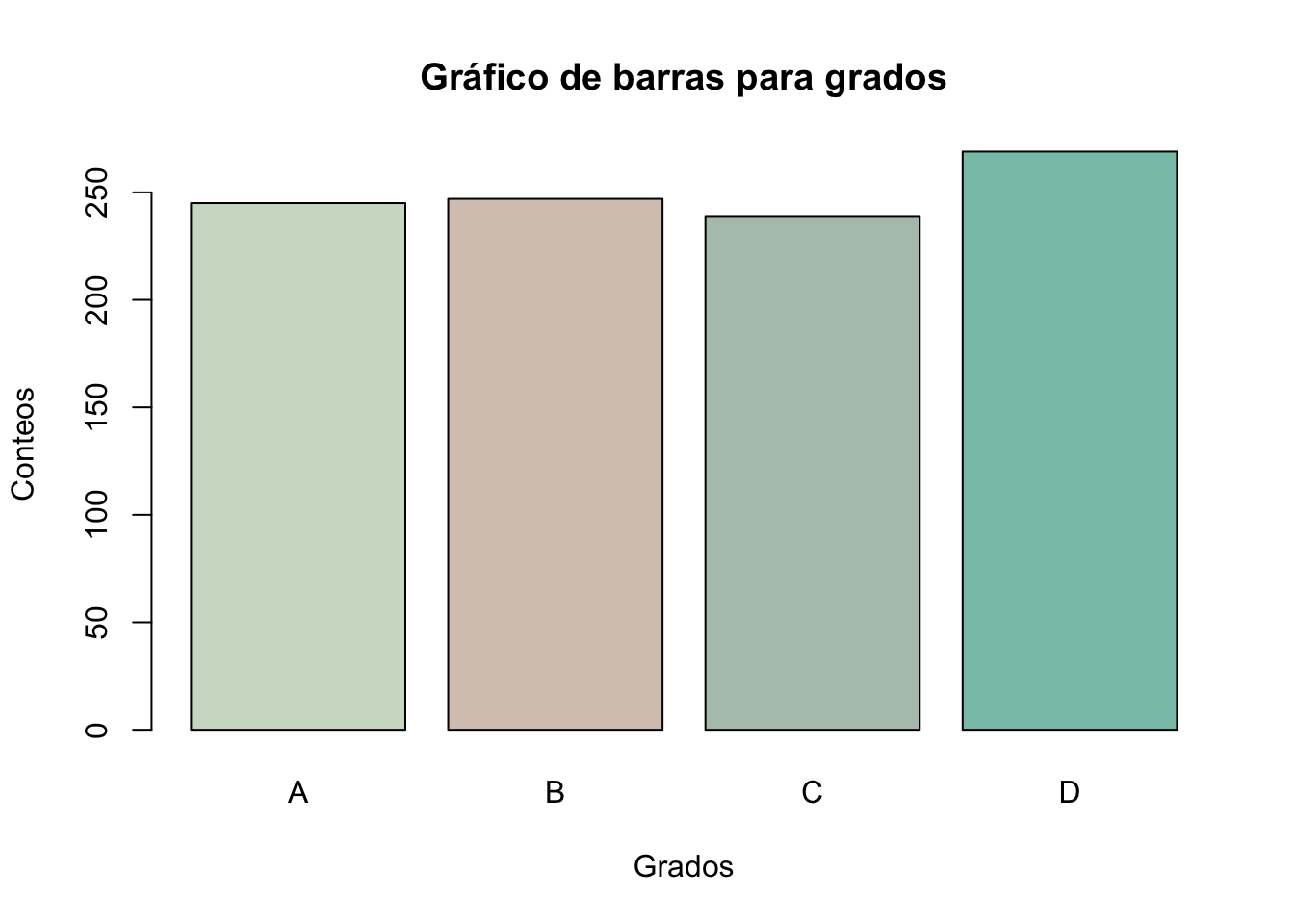 grados <- sample(LETTERS[1:4], 1000, TRUE)Con el código anterior creamos un objeto con 1000 datos de las letras de la A a la D con remplazo. Ahora podemos visualizar y contar cuantos grados (letras) hay