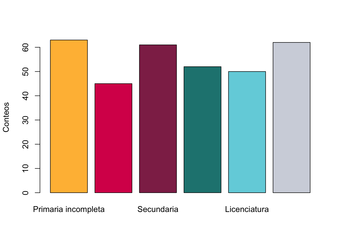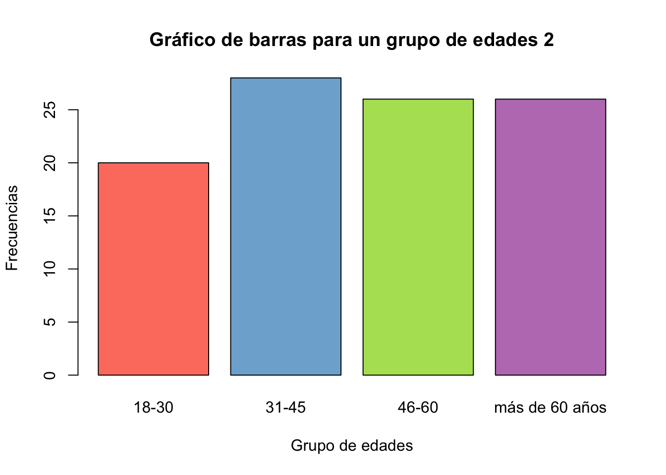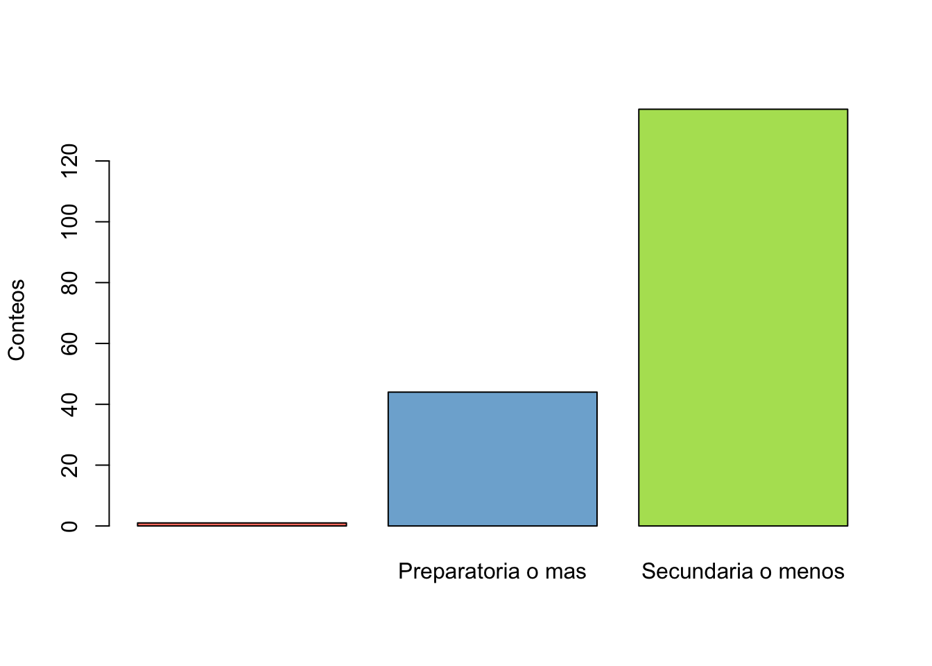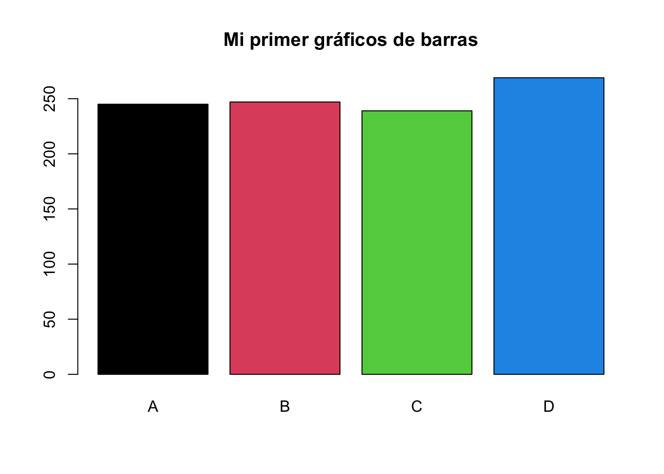 Tome en cuenta que la función barplot necesita ser alimentada con conteos, que en este caso, fueron obtenidos de la función table explicada en la sección anterior ¿Cómo obtener una tabla de frecuencias con R?. Utilizamos los colores del 1 al 4 con el argumento col y agregamos un título con el argumento main. Tome en cuenta que los títulos van entrecomillados.