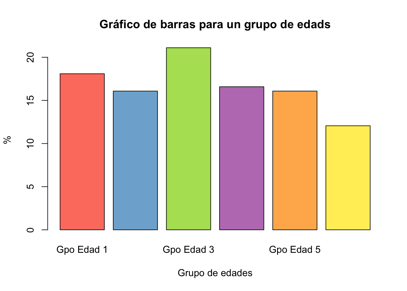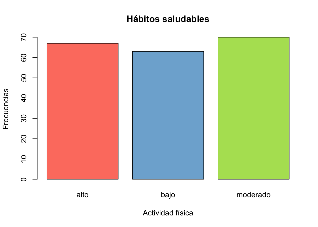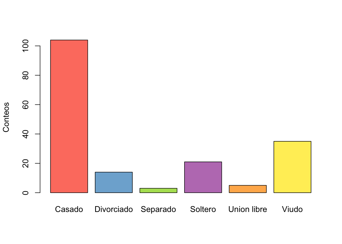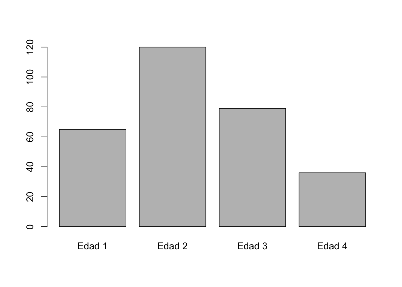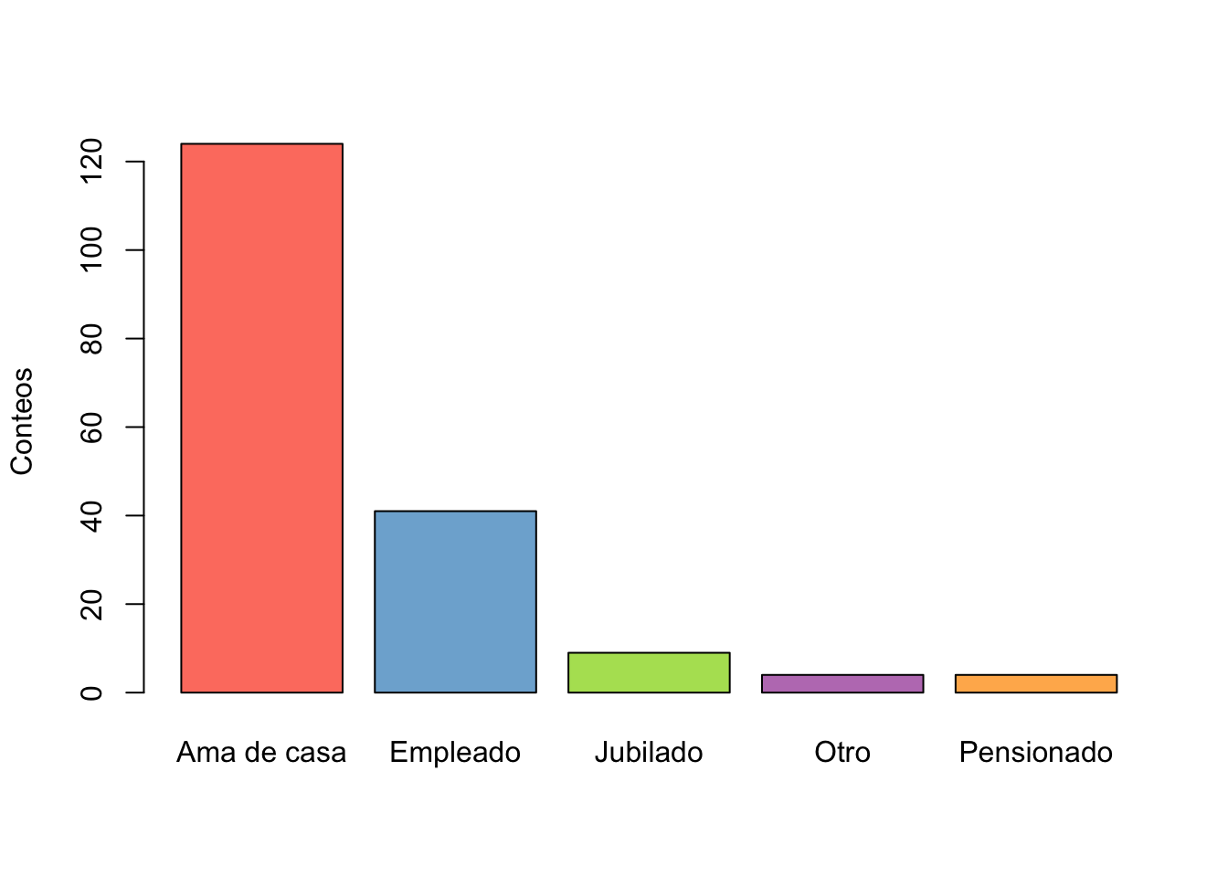 Tome en cuenta que la función barplot necesita ser alimentada con conteos, que en este caso, fueron obtenidos de la función table explicada en la sección anterior ¿Cómo obtener una tabla de frecuencias con R?. Utilizamos los colores del 1 al 4 con el argumento col y agregamos un título con el argumento main. Tome en cuenta que los títulos van entrecomillados.