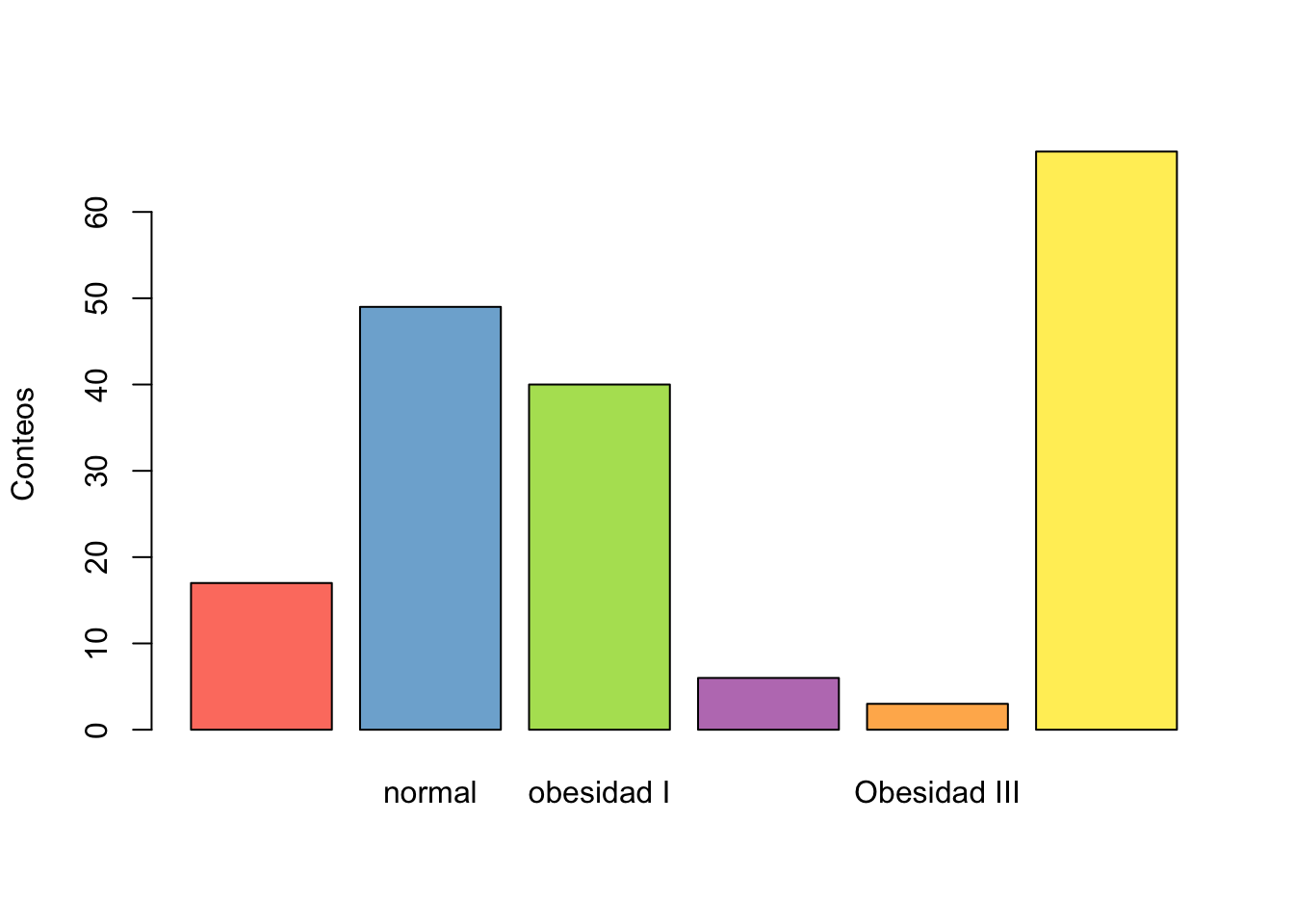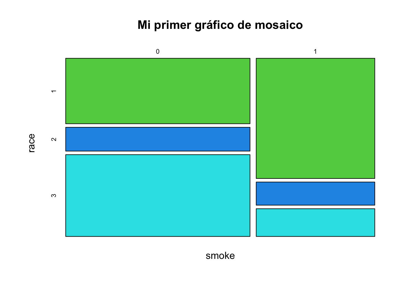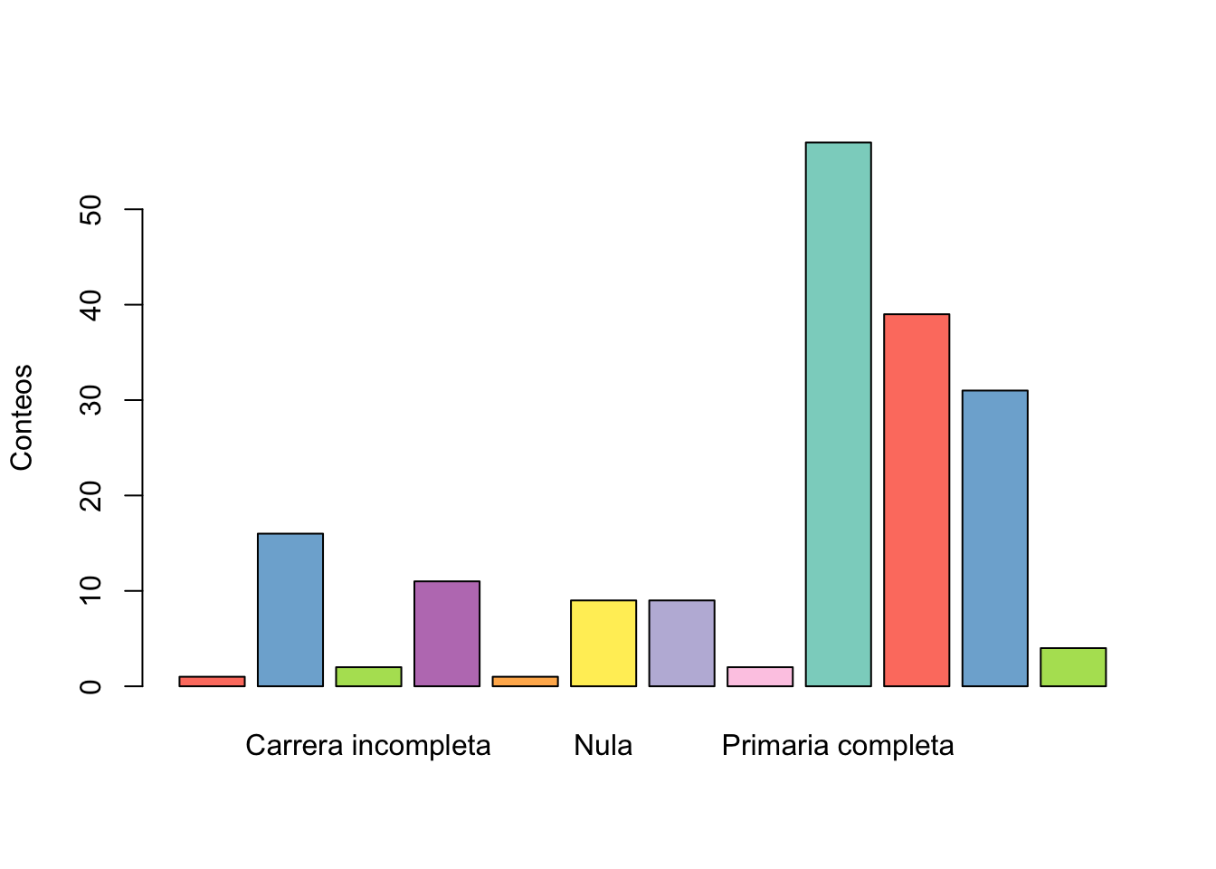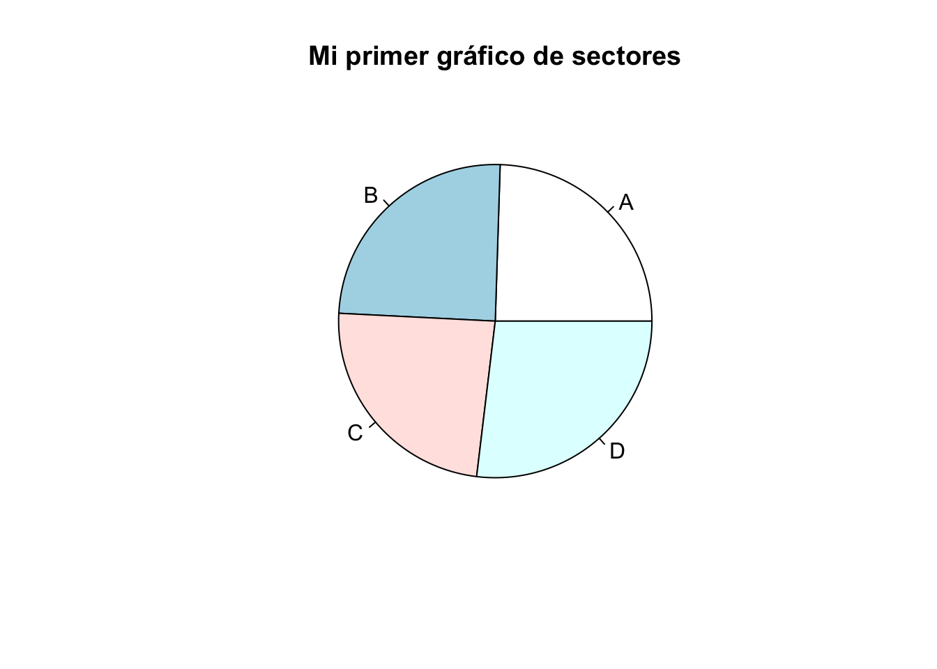 Tome en cuenta que la función barplot necesita ser alimentada con conteos, que en este caso, fueron obtenidos de la función table explicada en la sección anterior ¿Cómo obtener una tabla de frecuencias con R?. Utilizamos los colores del 1 al 4 con el argumento col y agregamos un título con el argumento main. Tome en cuenta que los títulos van entrecomillados.