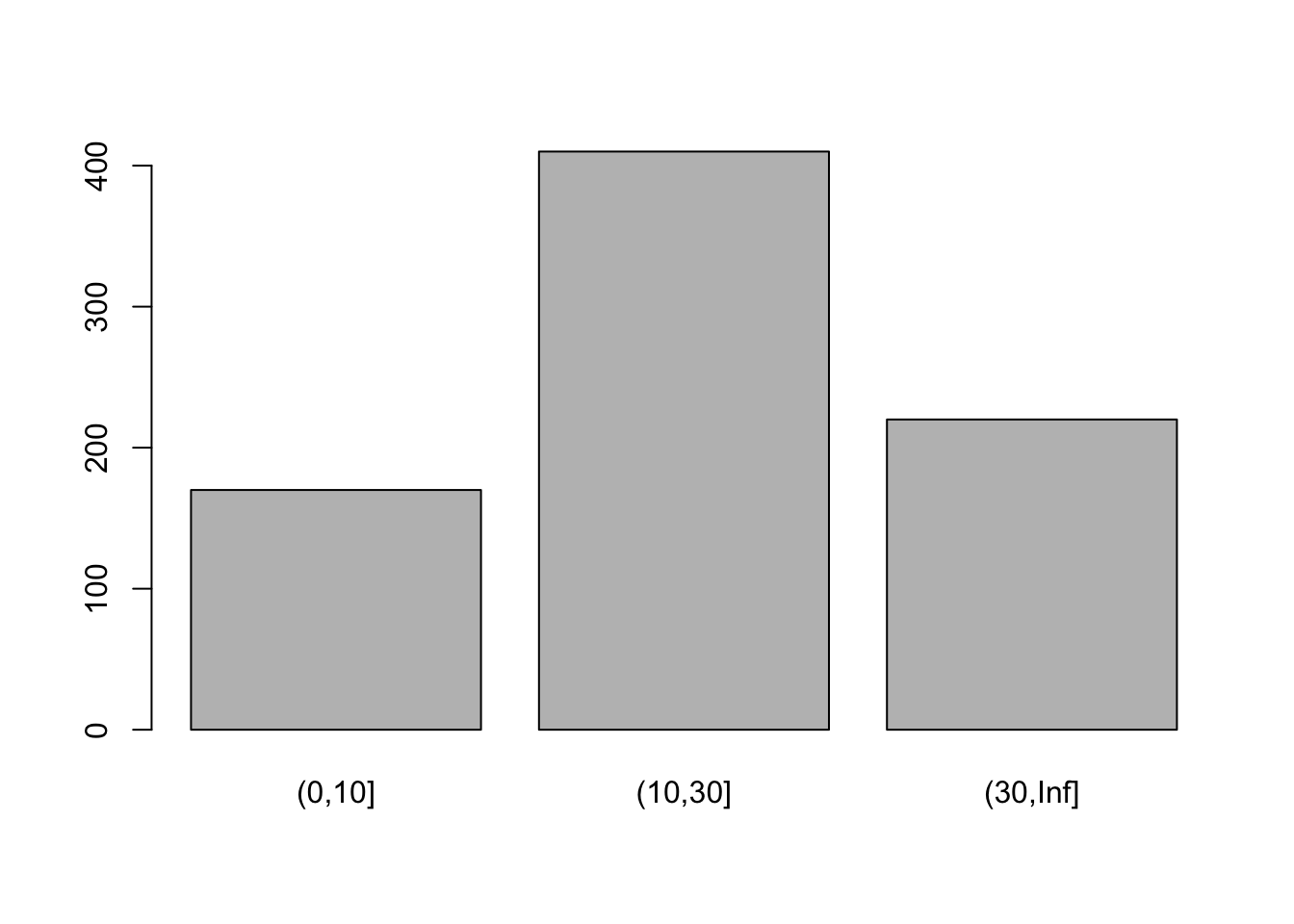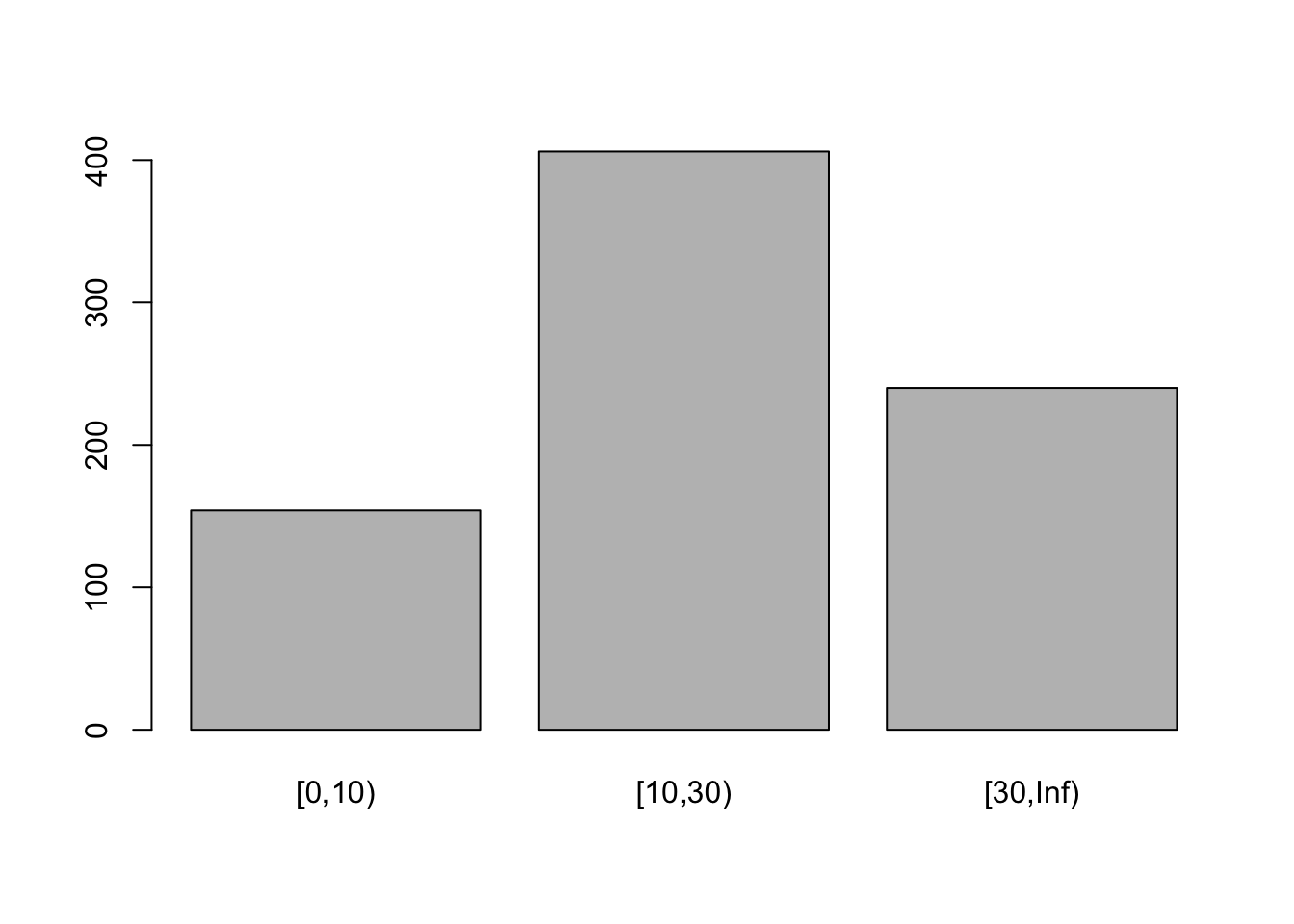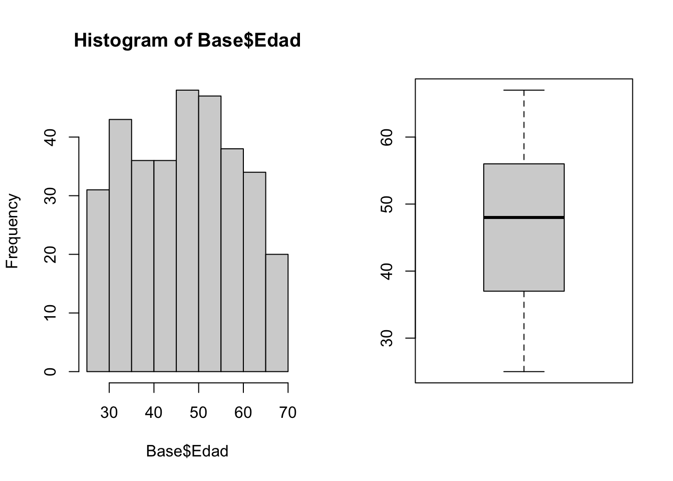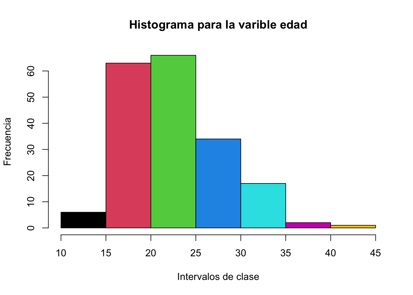 Explicación del código . El código de forma general, permitió la creación de un objeto data_freq que contiene una tabla de frecuencias con los conteos (objeto Freq), la frecuencia relativa (objeto Freq_Rela), la frecuencia acumulada (objeto Freq_Acum) y la frecuencia relativa acumulada (objeto Freq_Rela_Acum). Este objeto tomó los datos del x que creamos en el ejemplo Ejemplo 9.3. Para que los datos pudieran ser organizados de forma adecuada en un tabla, es necesario hacer la coerción a valores numéricos de los objetos.