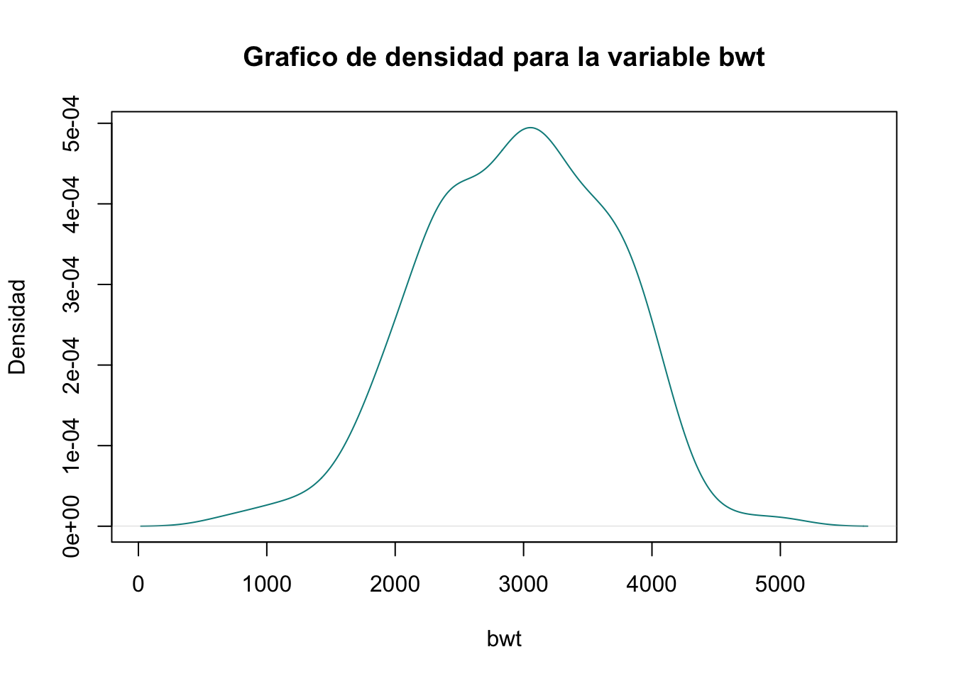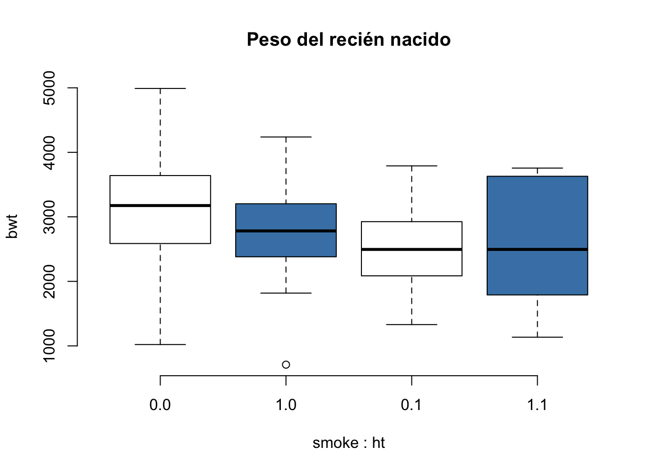 La sección de código bwt~smoke*ht indica el peso del recién nacido agrupado por el antecedente de tabaquismo y de hipertensión del madre. Con el argumento data podemos indicar de puede R obtner los datos y por tanto no es necesario utilizar el símbolo $.