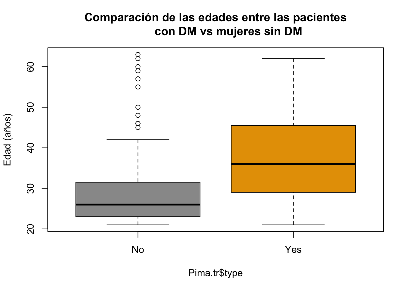 con DM vs mujeres sin DM", ylab="Edad (años)", col = c("#999999", "#E69F00"))