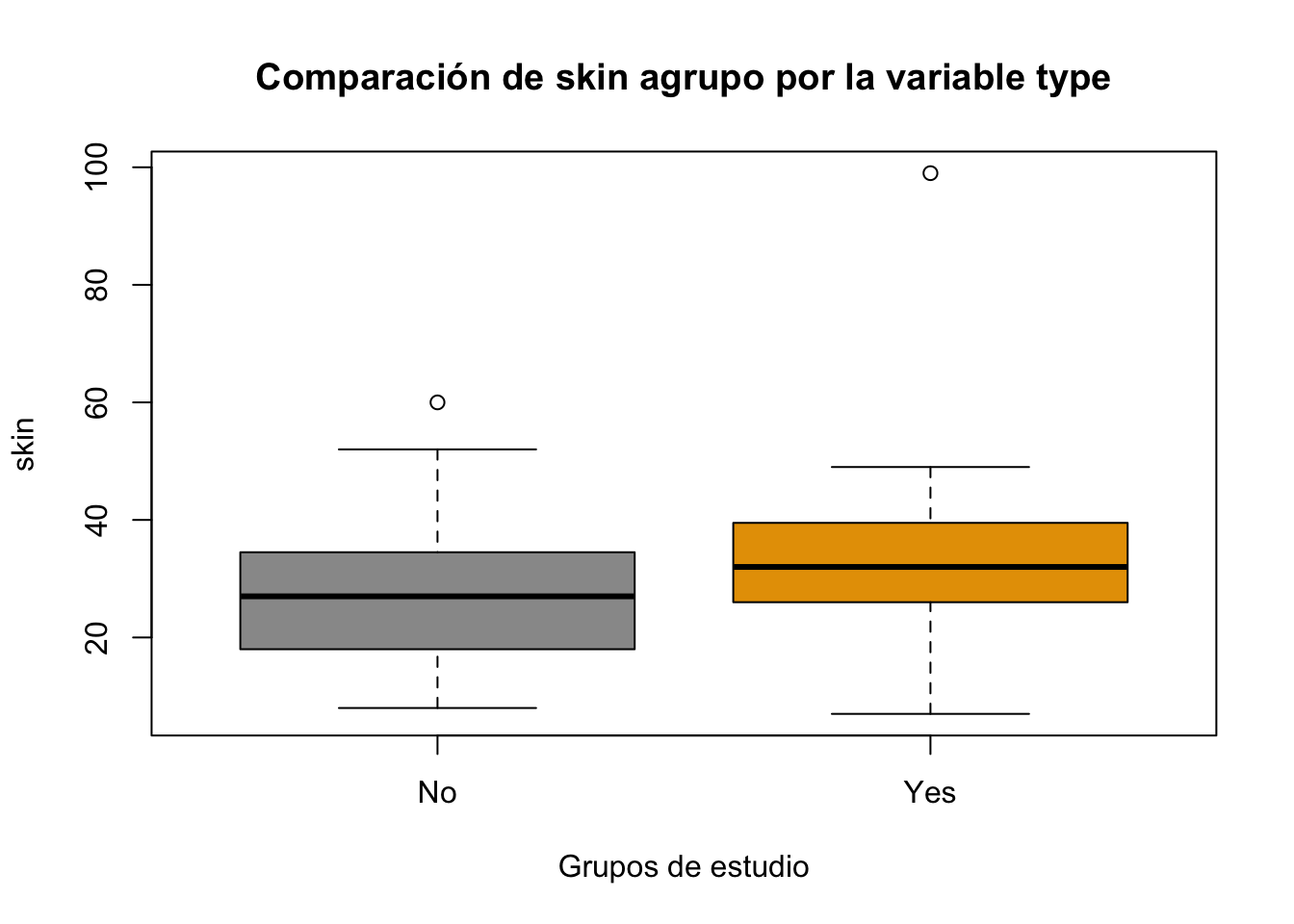 Ejercicio 9.24 Realice un boxplot para la variable skin agrupada por la variable type. Utilice la base Pima.tr. Cambie colores y agregue títulos