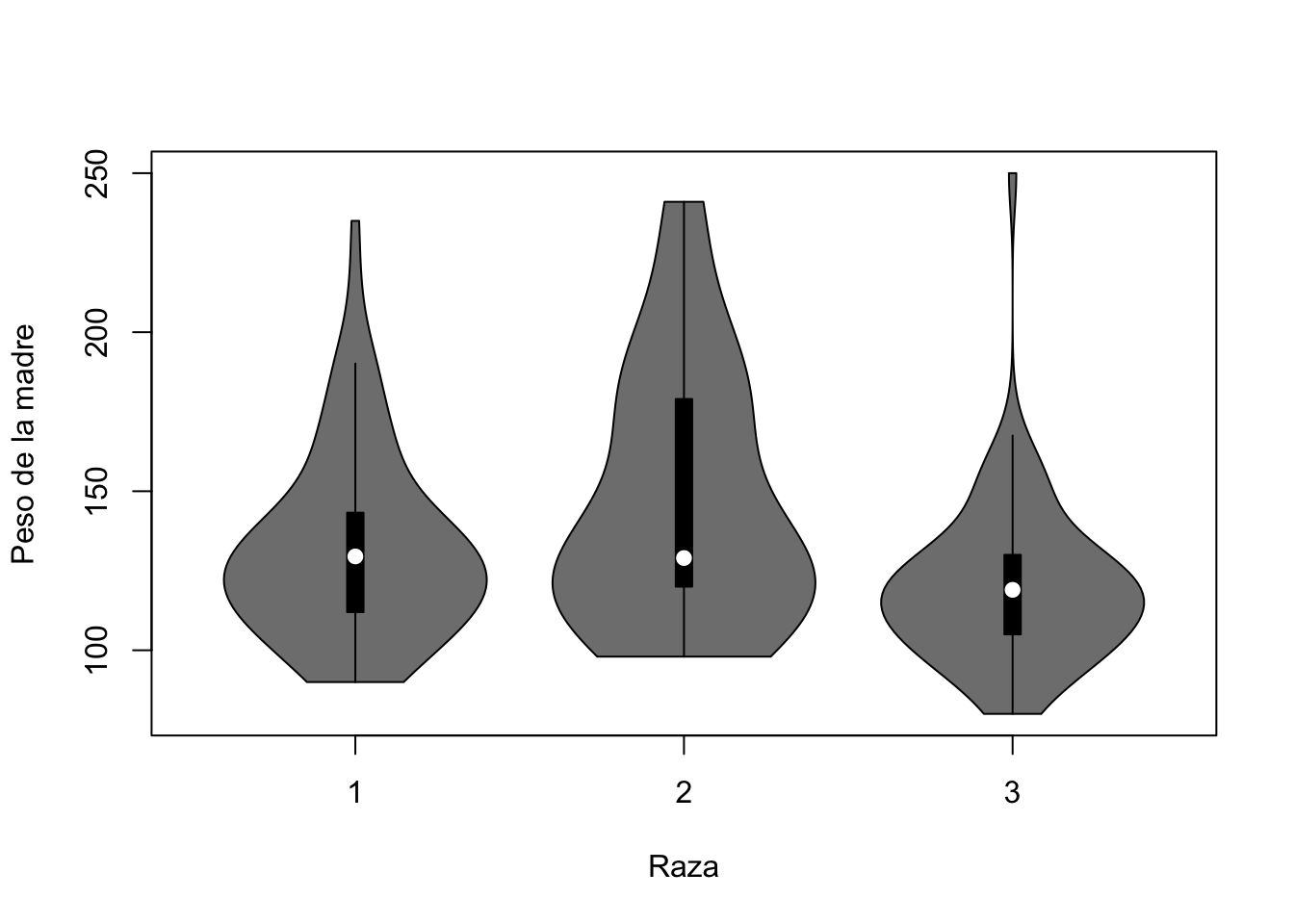 vioplot(birthwt$lwt~birthwt$race, ylab="Peso de la madre", xlab = "Raza")