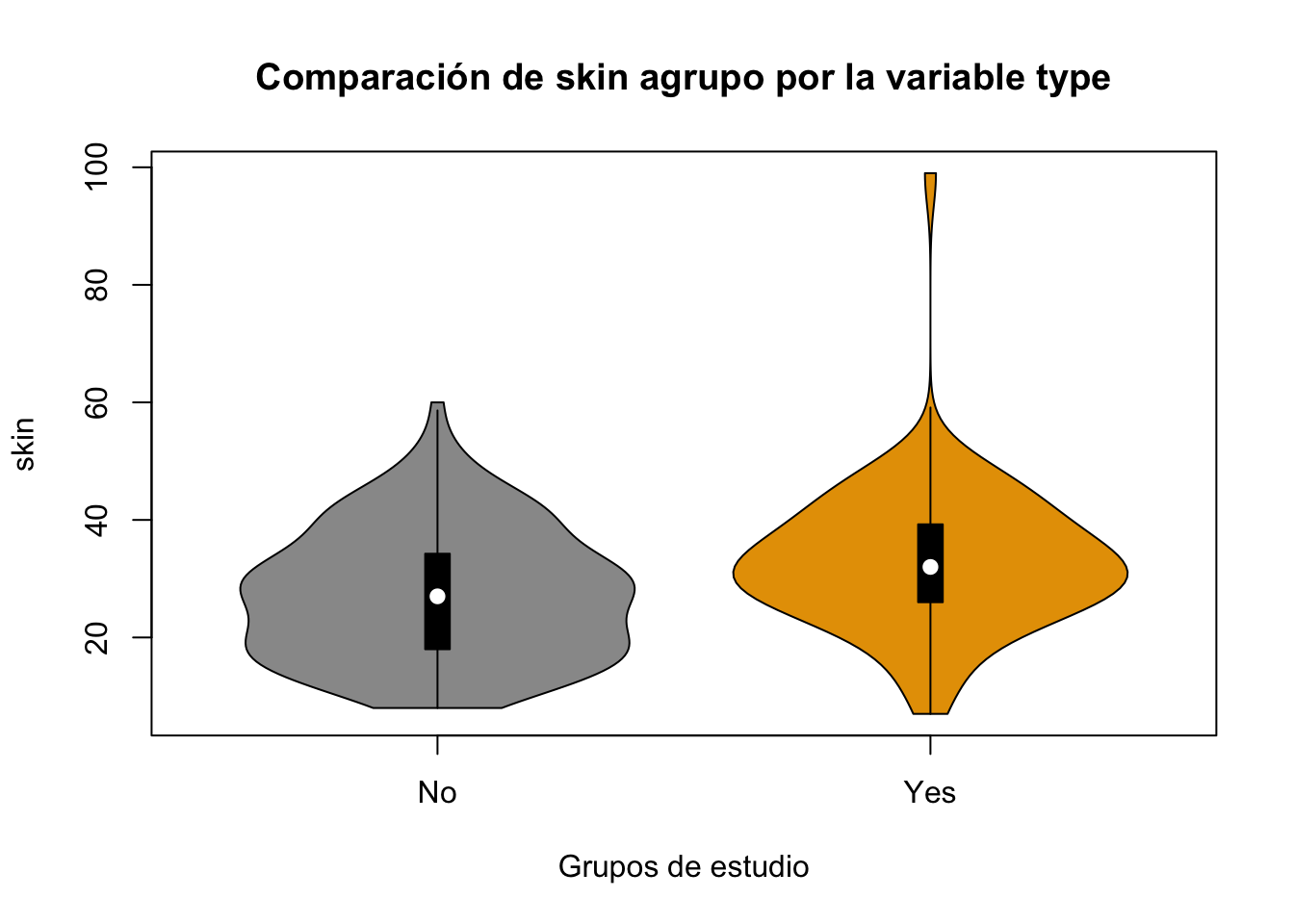 Ejercicio 9.27 Realice un gráfico de violin para la variable skin agrupada por la variable type. Utilice la base Pima.tr. Cambie colores y agregue títulos