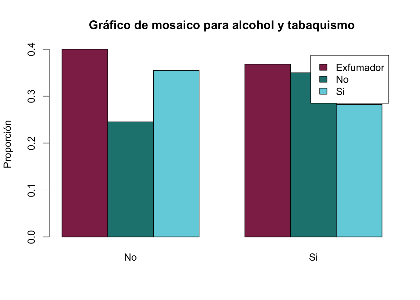 - Realice un gráfico de barras donde agrupe para las variables Alcohol y Tabaquismo. El eje de las “y” deberá de estar en proporciones.