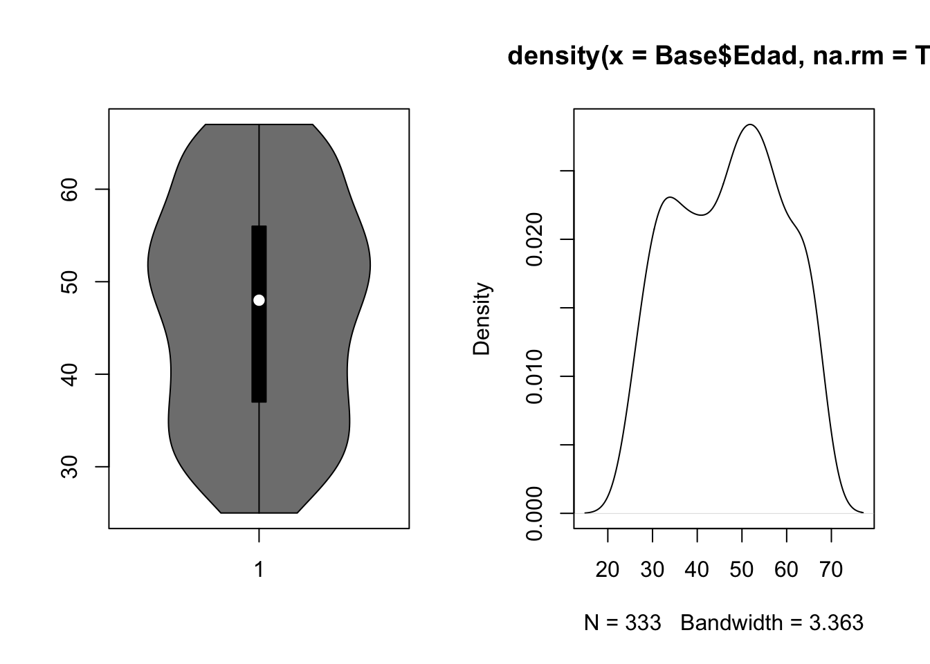 install.packages("vioplot")library("vioplot")Repetimos la misma gráfica del punto anterior pero esta vez utilizando la función vioplot