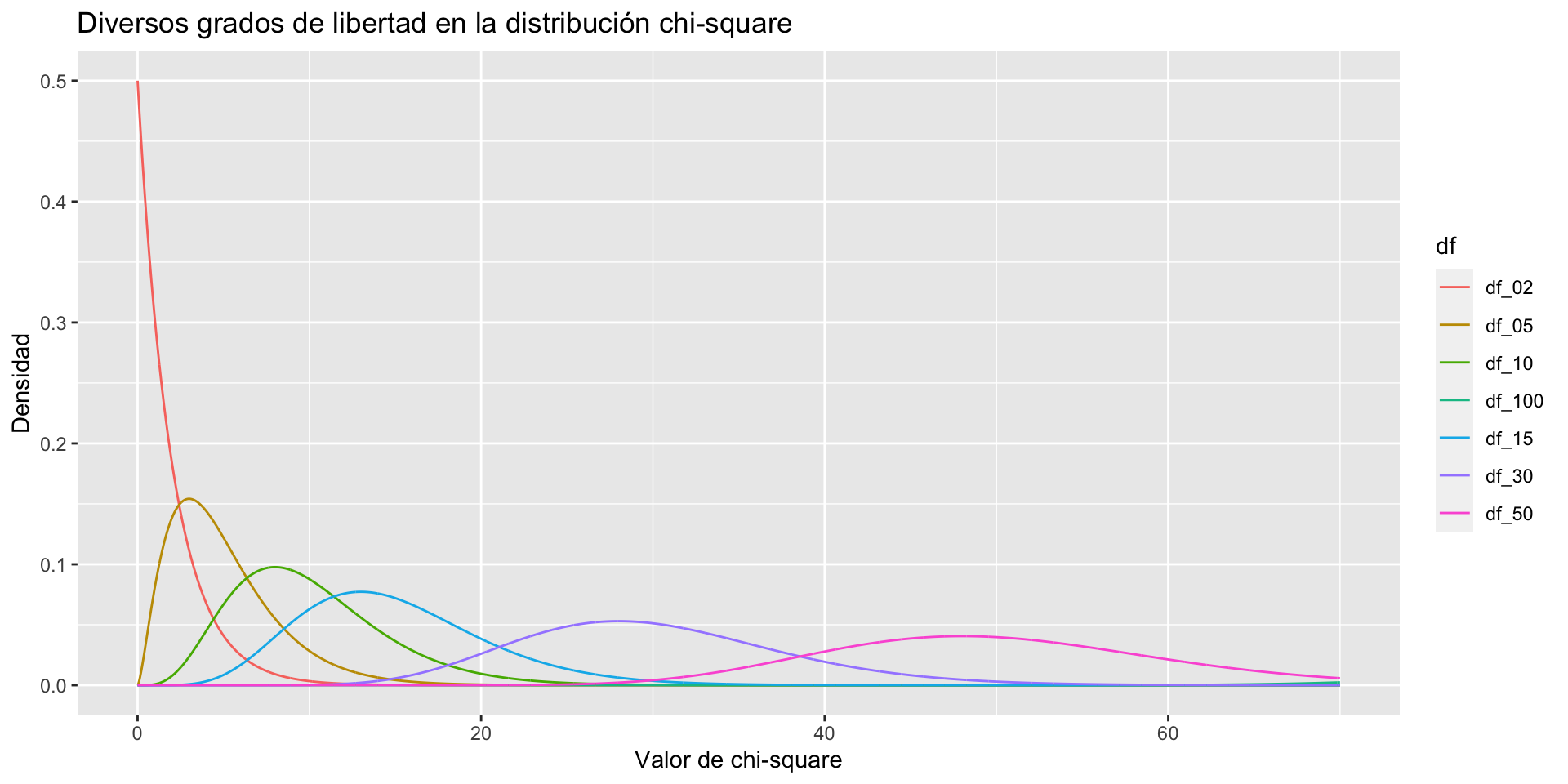 \[\chi^2_{(n)}= z^2_1+z^2_2+ \cdot \ \cdot \ \cdot+ z^2_n\] Es la suma de los valores \(z^2\) resultantes tendrá una distribución \(\chi^2\), con \(n\) grados de libertad