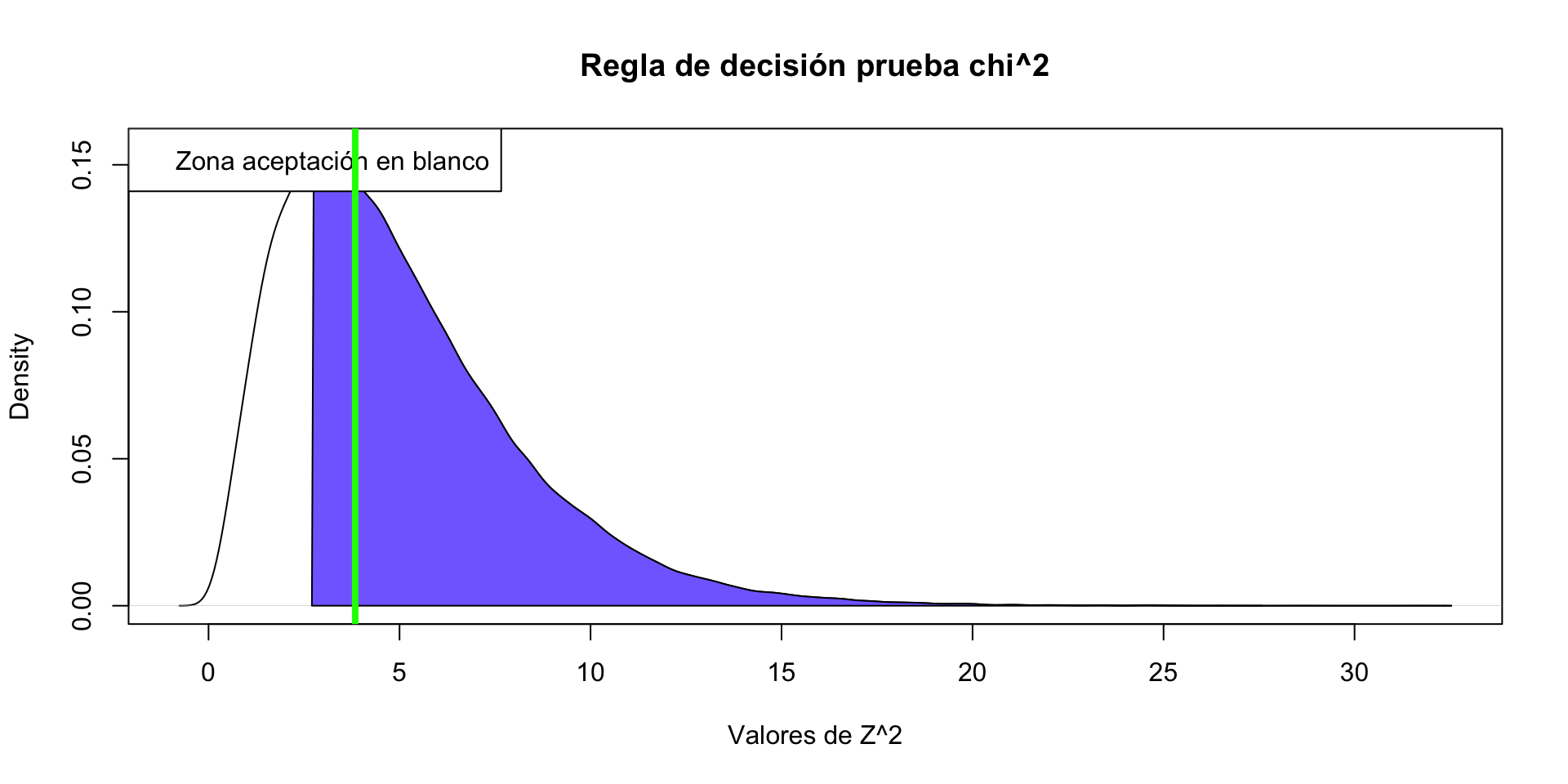 Cada valor de \(z\) puede elevarse al cuadrado para obtener \(z^2\). Cuando se estudia la distribución muestra de \(z^2\), se observa que sigue una distribución \(\chi^2\) con 1 grado de libertad. Es decir: