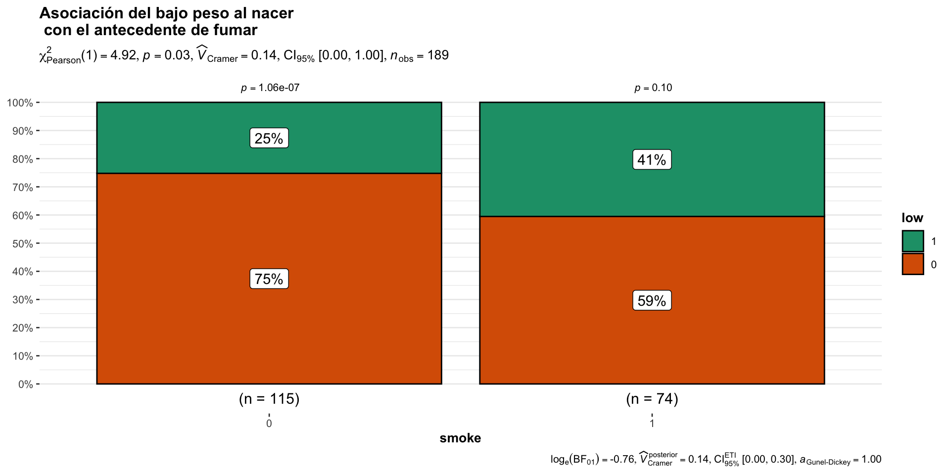 library(ggstatsplot)ggbarstats(data=birthwt,x=low,y=smoke, type ="parametric",title ="Asociación del bajo peso al nacer \n con el antecedente de fumar",subtitle ="Utilizando Ji cuadrada")