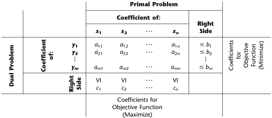 The primal-dual table for linear programming (Table 6.2 ) also helps to highlight the correspondence between the two problems. It shows all the linear programming parameters (the \(a_{i j}, b_{i}\) and \(c_{j}\)) and how they are used to construct the two problems. All the headings for the primal problem are horizontal, whereas the headings for the dual problem are read by turning the book sideways. For the primal problem, each column (except the right-side column) gives the coefficients of a single variable in the respective constraints and then in the objective function, whereas each row (except the bottom one) gives the parameters for a single contraint. For the dual problem, each row (except the right-side row) gives the coefficients of a single variable in the respective constraints and then in the objective function, whereas each column (except the rightmost one) gives the parameters for a single constraint. In addition, the right-side column gives the right-hand sides for the primal problem and the objective function coefficients for the dual problem, whereas the bottom row gives the objective function coefficients for the primal problem and the right-hand sides for the dual problem.