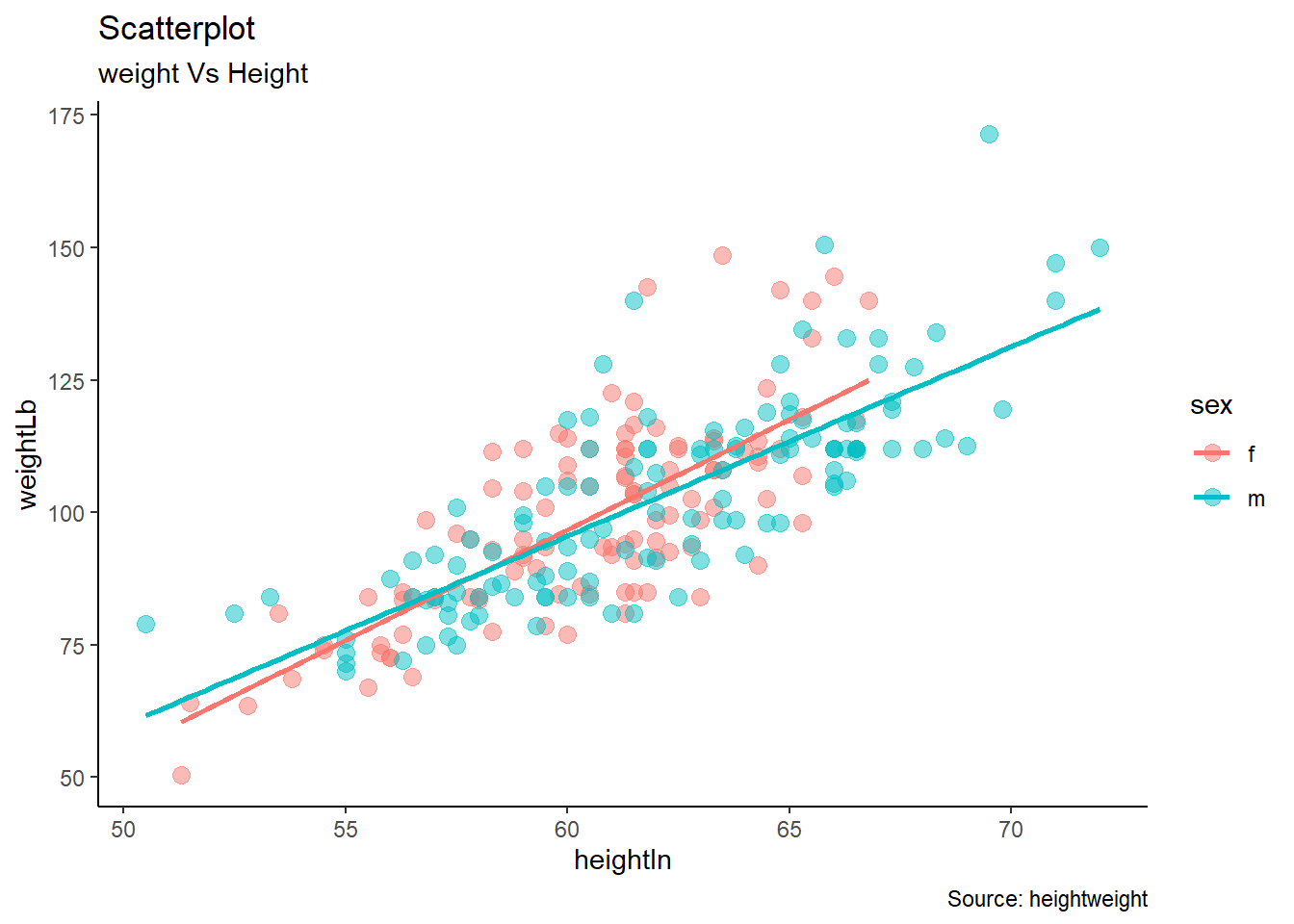 ggplot(data=heightweight, mapping = aes(x=heightIn, y=weightLb, color=sex))+