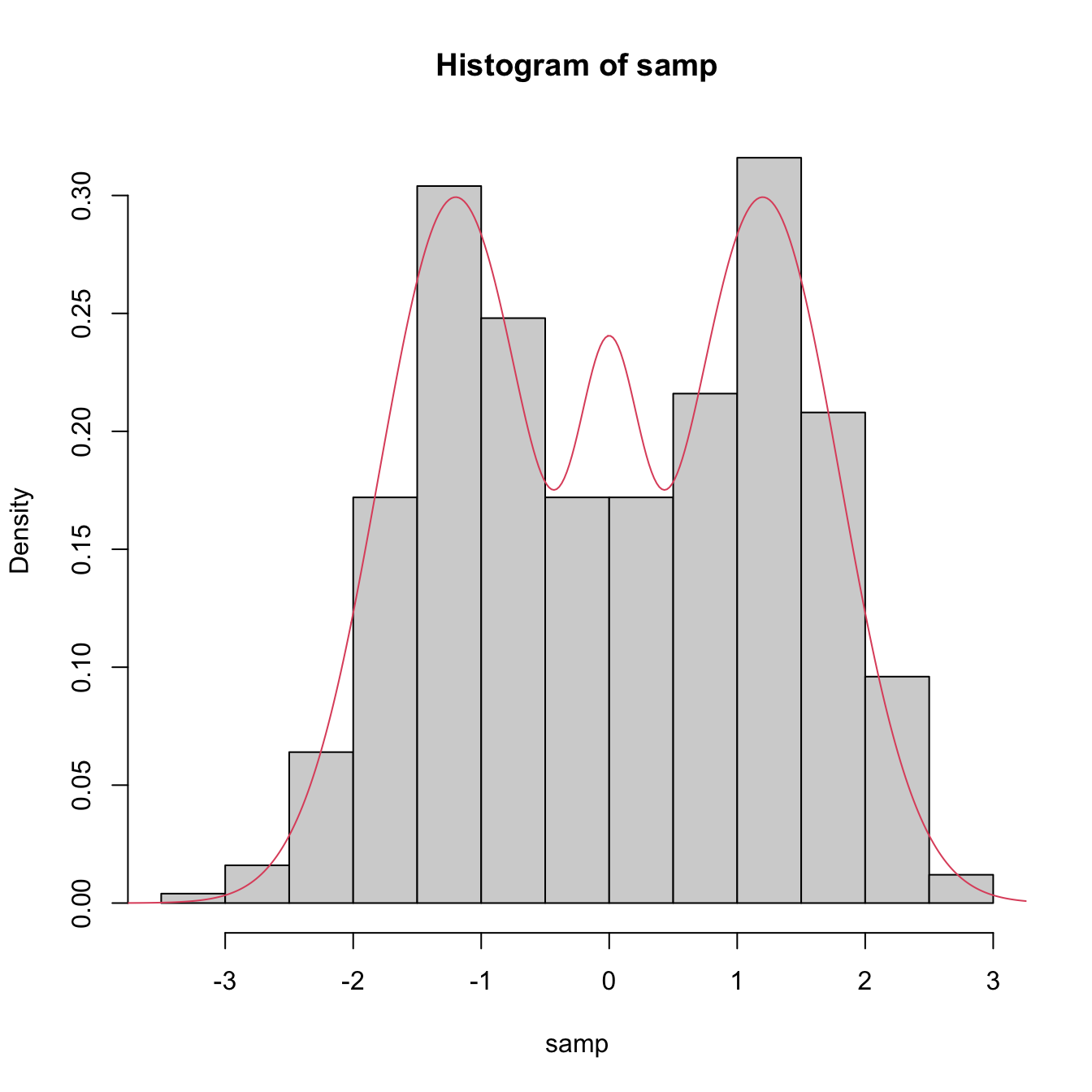 samp <- rnorMix(n = 500, obj = MW.nm9) # MW object in the second argument