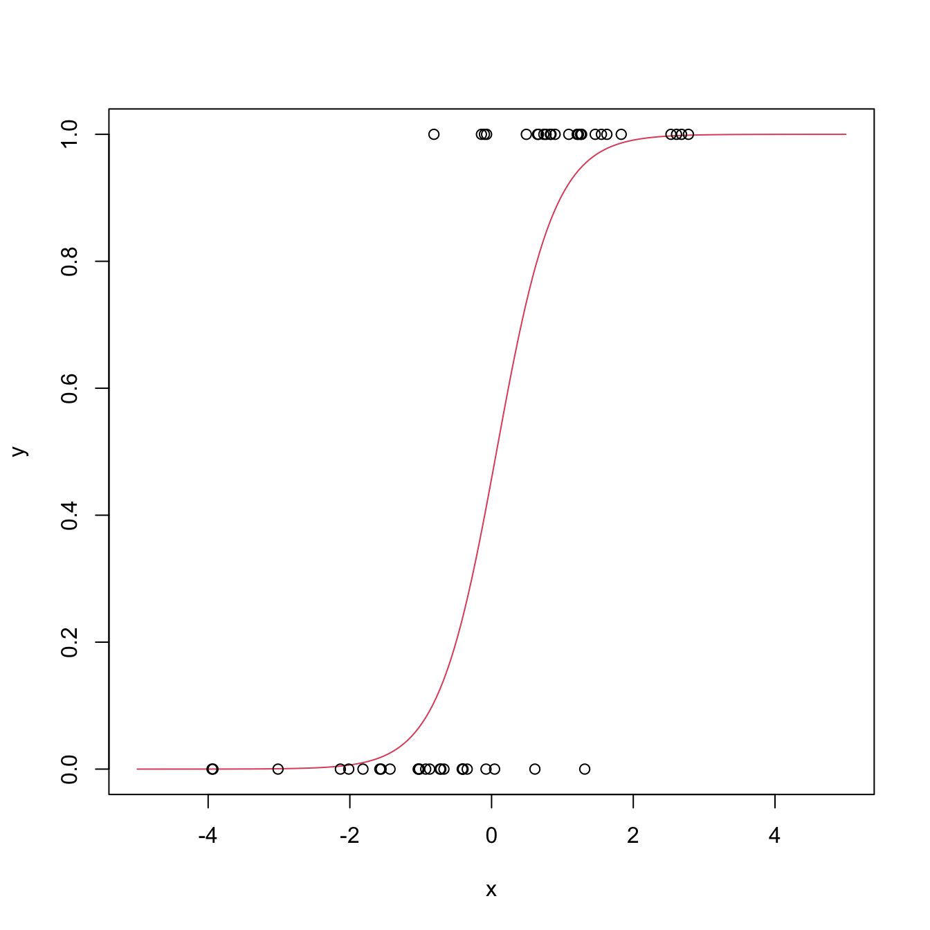 yGrid <- 1 / (1 + exp(-(mod$coefficients[1] + mod$coefficients[2] * xGrid)))