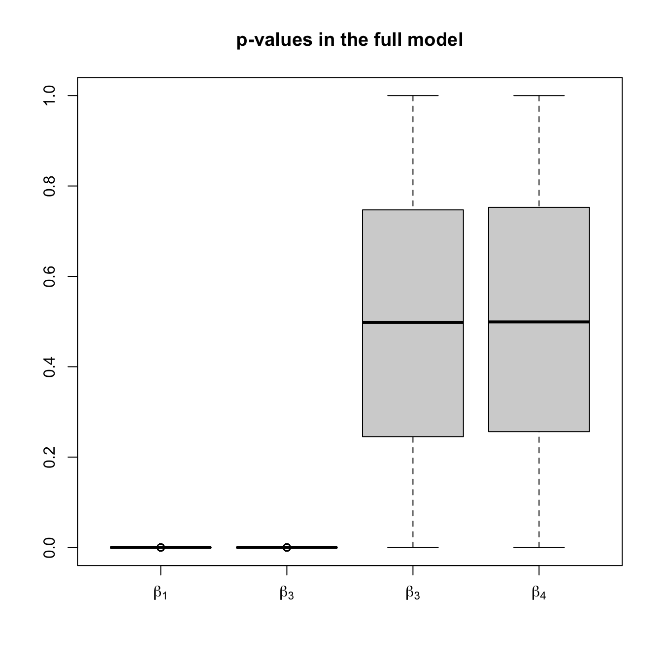 where \(\beta_1=\beta_2=1,\) \(\beta_3=\beta_4=0,\) and \(\varepsilon\sim\mathcal{N}(0,1).\) The next chunk of code analyses the significances of the four coefficients for: