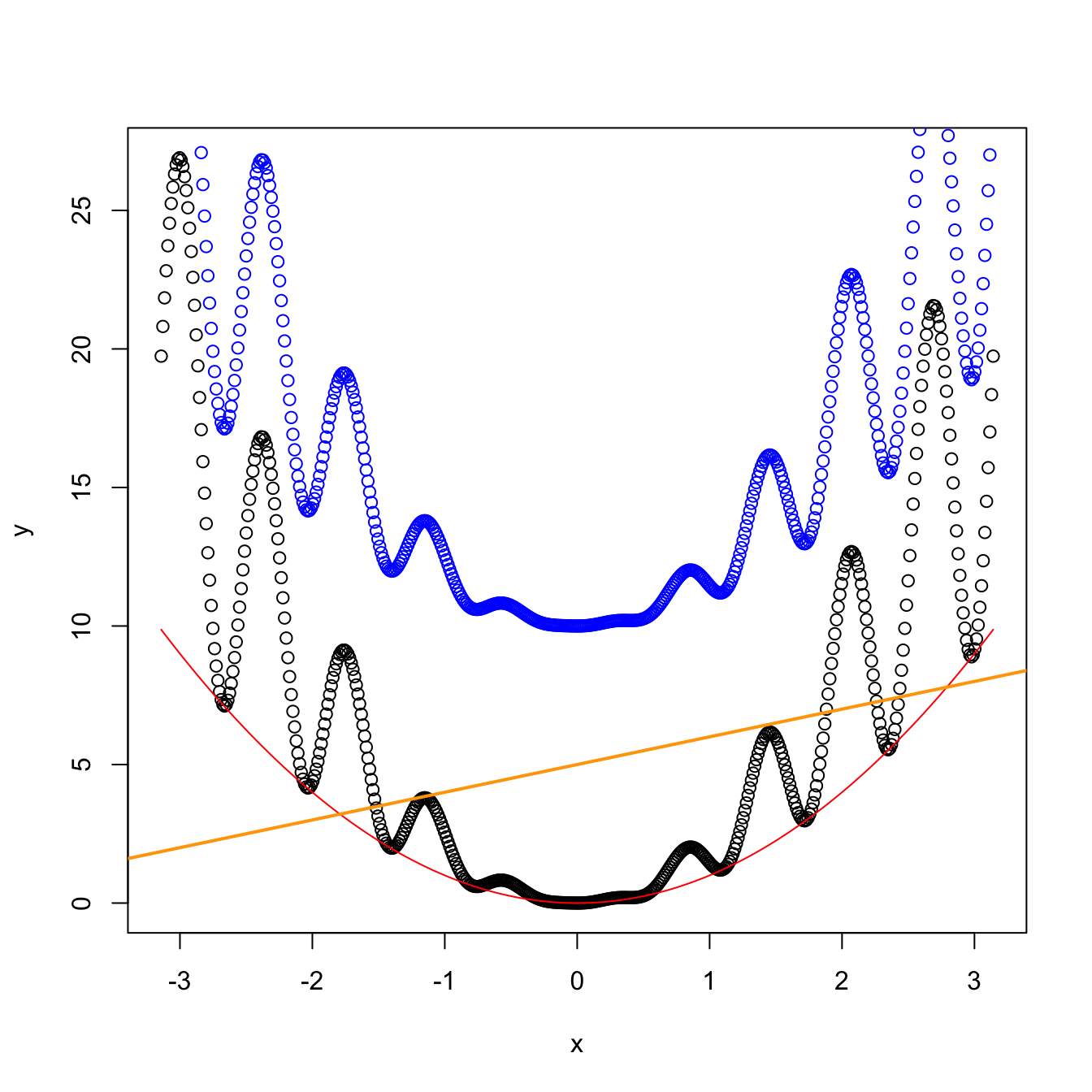 lines(x, beta0 + beta1 * x, lwd = 2, col = 2)