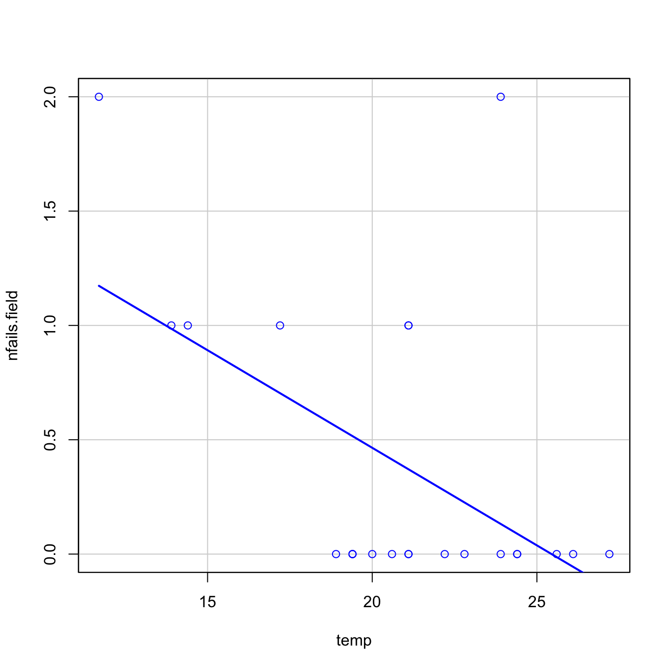 car::scatterplot(nfails.field ~ temp, smooth = FALSE, boxplots = FALSE,