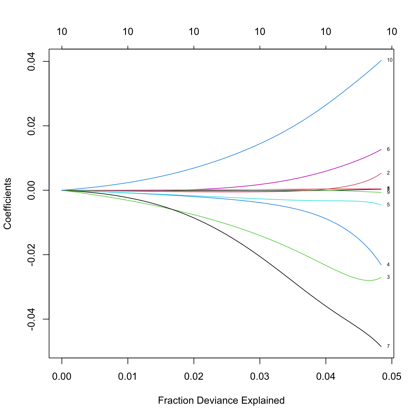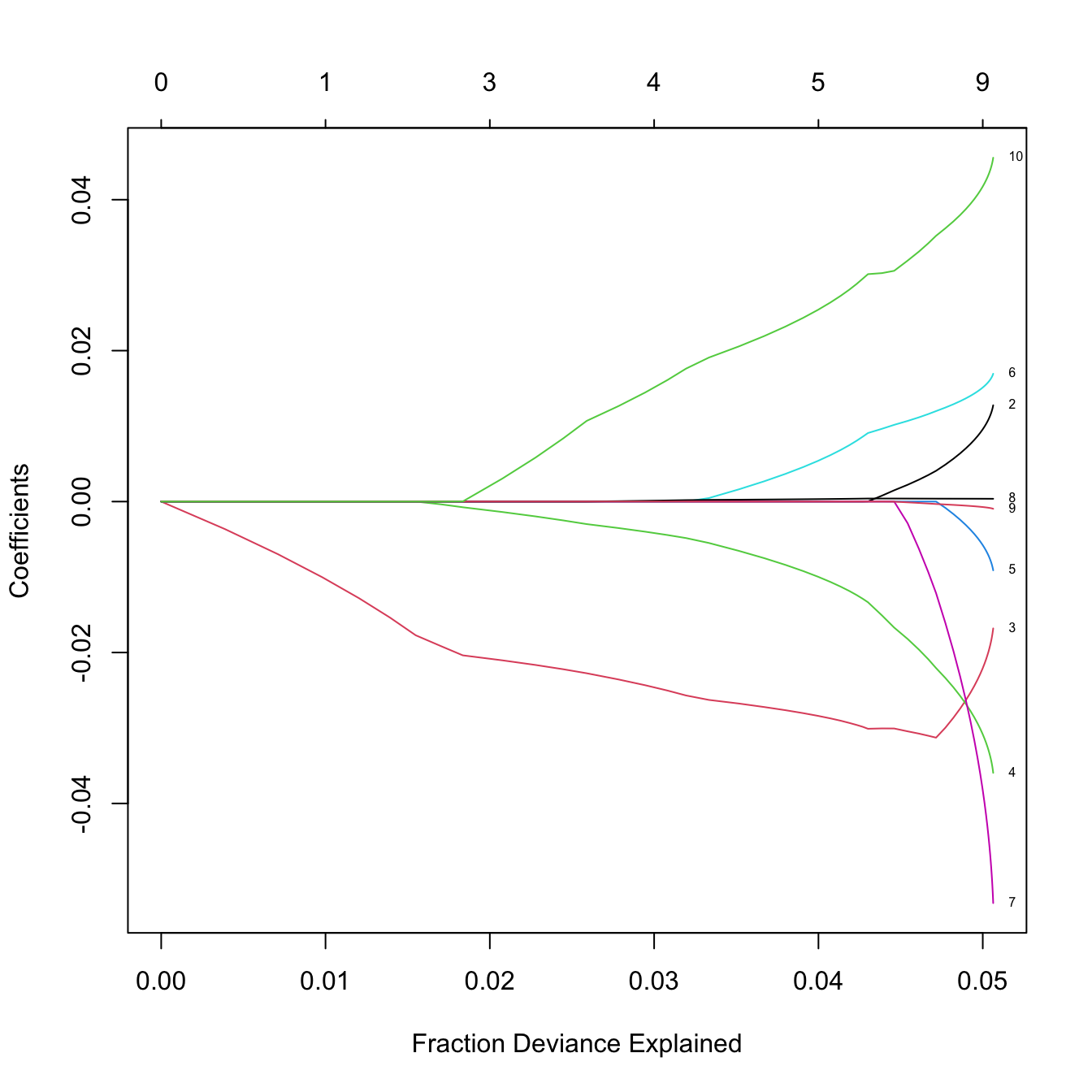 # The percentage of deviance explained only goes up to 0.05. There are no