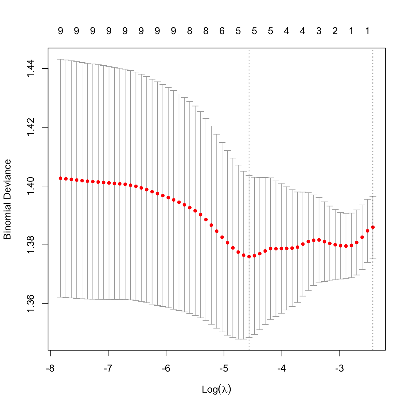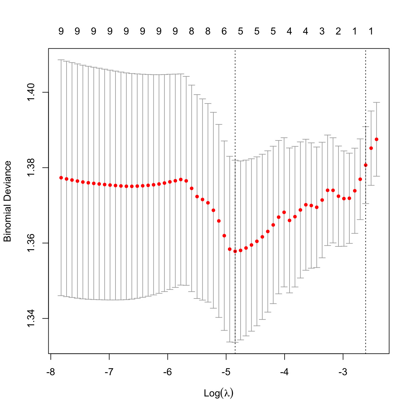 kcvLasso <- cv.glmnet(x = x, y = y, alpha = 1, nfolds = 10, family = "binomial")