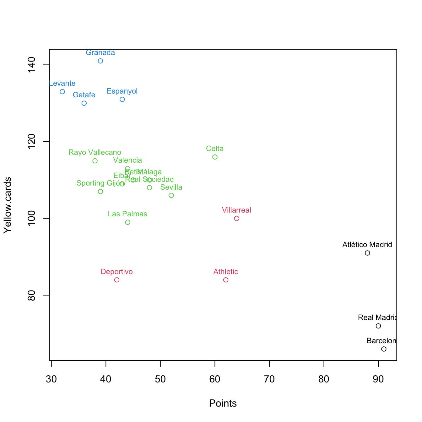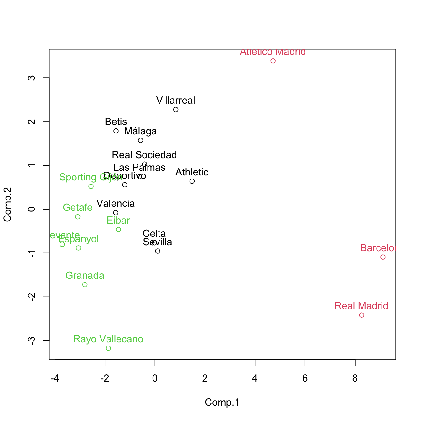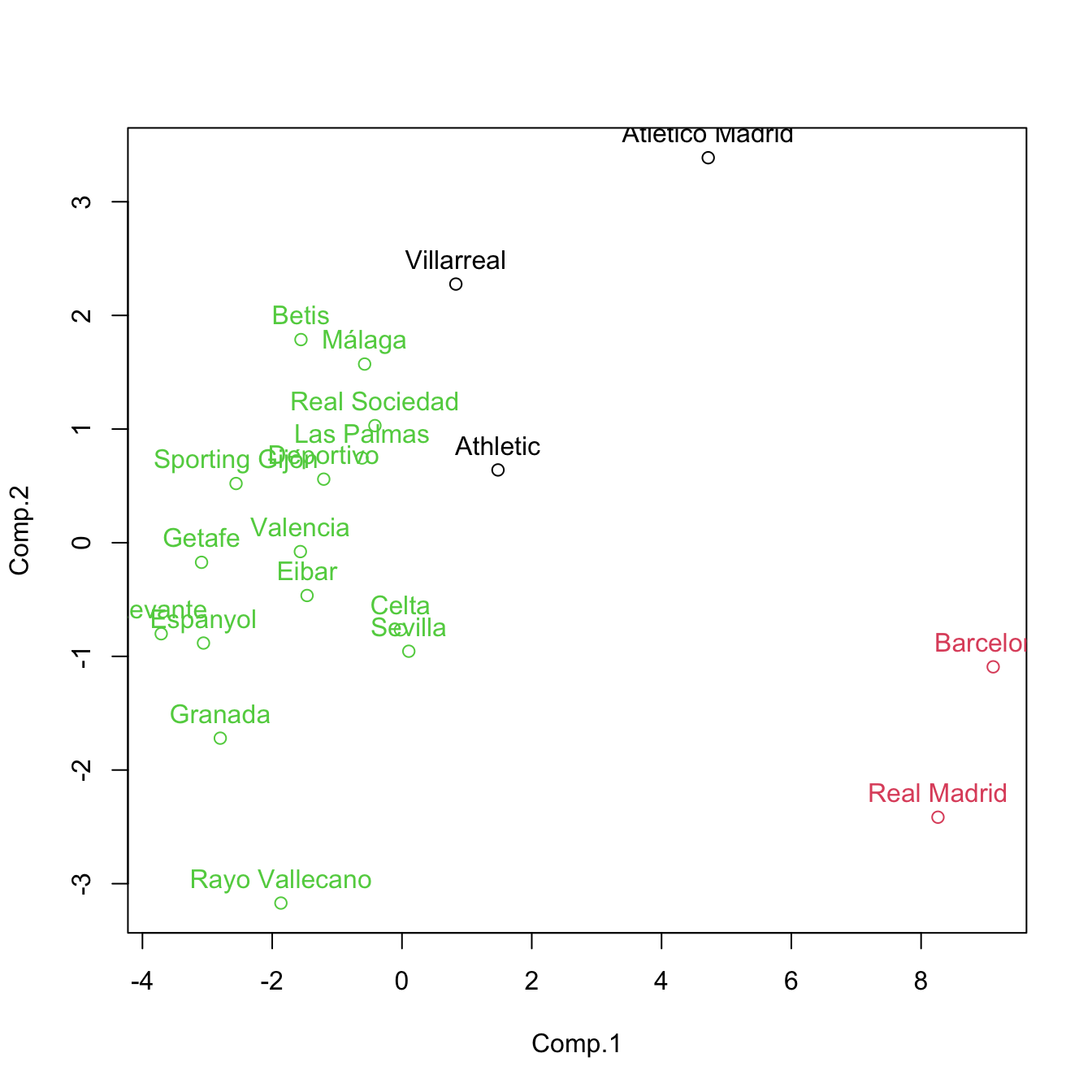 Let’s analyze the possible clusters in a smaller subset of La Liga 2015/2016 (download) dataset, where the results can be easily visualized. To that end, import the data as laliga.