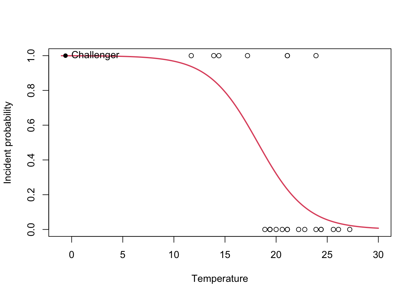 plot(challenger$temp, challenger$fail.field, xlim = c(-1, 30), xlab = "Temperature",