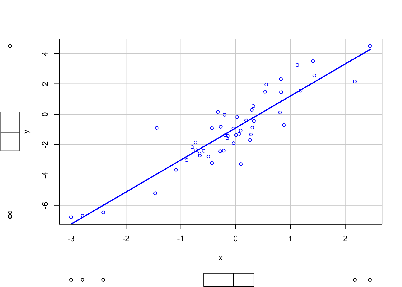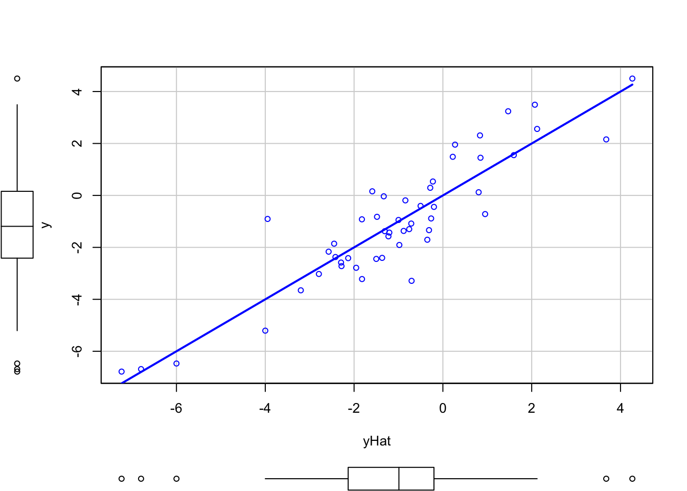 The \(R^2\) is related with the sample correlation coefficient \[\begin{align*} r_{xy}=\frac{s_{xy}}{s_xs_y}=\frac{\sum_{i=1}^n \left(X_i-\bar X \right)\left(Y_i-\bar Y \right)}{\sqrt{\sum_{i=1}^n \left(X_i-\bar X \right)^2}\sqrt{\sum_{i=1}^n \left(Y_i-\bar Y \right)^2}} \end{align*}\] and it can be seen that \(R^2=r_{xy}^2\). Interestingly, it also holds that \(R^2=r^2_{y\hat y}\), that is, the square of the sample correlation coefficient between \(Y_1,\ldots,Y_n\) and \(\hat Y_1,\ldots,\hat Y_n\) is \(R^2\), a fact that is not immediately evident. This can be easily by first noting that \[\begin{align} \hat Y_i=\hat\beta_0+\hat\beta_1X_i=(\bar Y-\hat\beta_1X_i)+\hat\beta_1X_i=\bar Y+\hat\beta_1(X_i-\bar X) \tag{2.12} \end{align}\] and then replacing (2.12) into \[\begin{align*} r^2_{y\hat y}=\frac{s_{y\hat y}^2}{s_y^2s_{\hat y}^2}=\frac{\left(\sum_{i=1}^n \left(Y_i-\bar Y \right)\left(\hat Y_i-\bar Y \right)\right)^2}{\sum_{i=1}^n \left(Y_i-\bar Y \right)^2\sum_{i=1}^n \left(\hat Y_i-\bar Y \right)^2}=\frac{\left(\sum_{i=1}^n \left(Y_i-\bar Y \right)\left(\bar Y+\hat\beta_1(X_i-\bar X)-\bar Y \right)\right)^2}{\sum_{i=1}^n \left(Y_i-\bar Y \right)^2\sum_{i=1}^n \left(\bar Y+\hat\beta_1(X_i-\bar X)-\bar Y \right)^2}=r^2_{xy}. \end{align*}\]