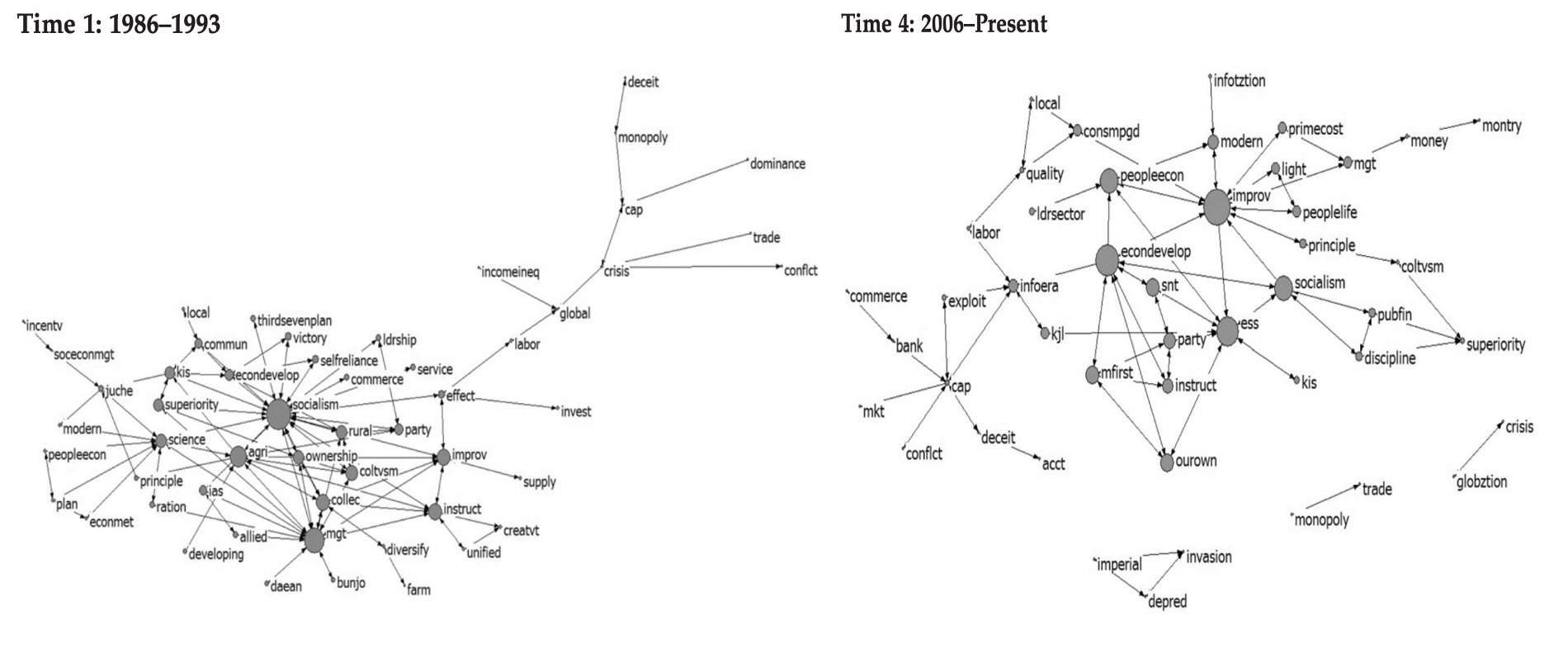 Alternatively, you might look at the specific structure of words and arguments in text to understand. That’s what researchers did when they looked at journal titles written by state-employed economists in North Korea, to understand how government concerns towards the economy had changed over time. The words are treated as a network, and so their use and connections can be seen as changing over time. The larger a word is in the figures below the more often it is used, and the lines connect it to other words its often used in a sentence along with. Below you can see that in the earliest period studied North Korea was focused on words like socialism, collectivism, and management, while in the later period (on the right) thinks like modernization and economic development take a central place. While semantic networks can identify the key words in a given text, it is up to the researcher to identify the context and meaning of the words being used.