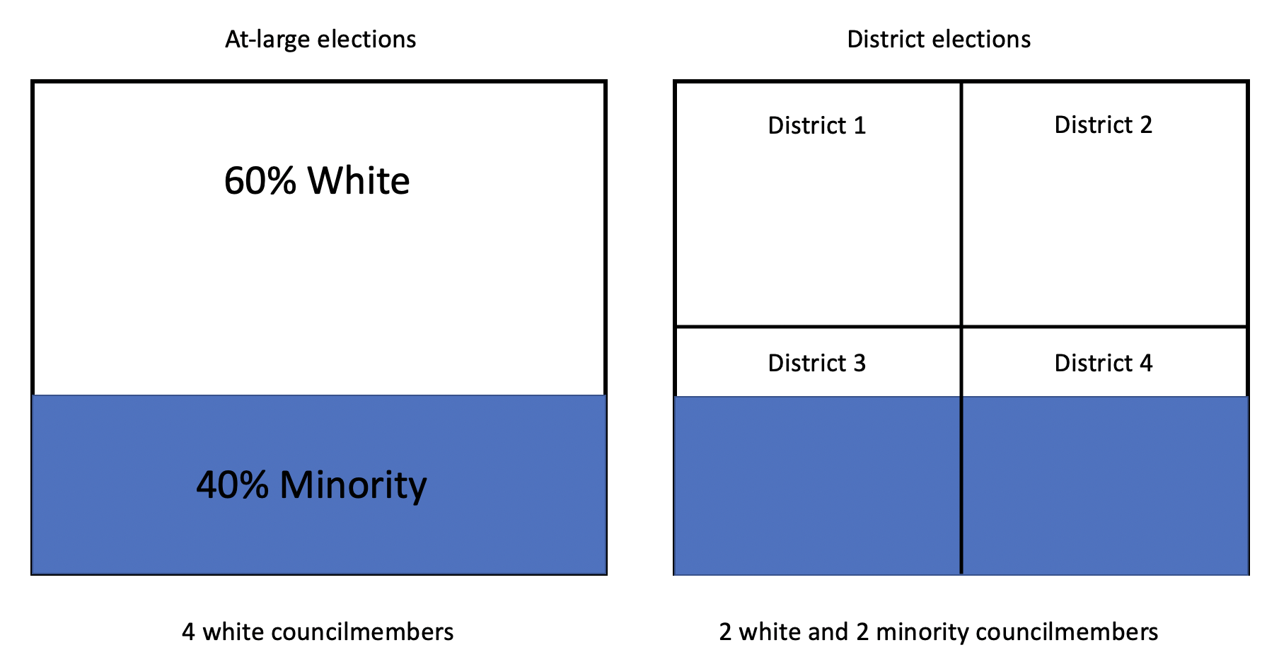 For instance, the state of California was concerned about minority representation on city councils that had at-large district elections. In an at-large district election voters vote for as many candidates for city council as there are position, while in a single district elections voters vote only for their representative. California was concerned that minorities, who are often geographically concentrated in a city, weren’t being represented in at-large elections. To give a very oversimplified example, let’s say the City of New Helvetia is 60% white and 40% minority. With an at-large electoral system (where everyone votes only for candidates of the same race), all 4 councilmembers will be white receiving 60% of the vote, while any minority candidates will fail to qualify. Splitting the city into 4 districts though would provide 2 white councilmembers and 2 minority councilmembers.