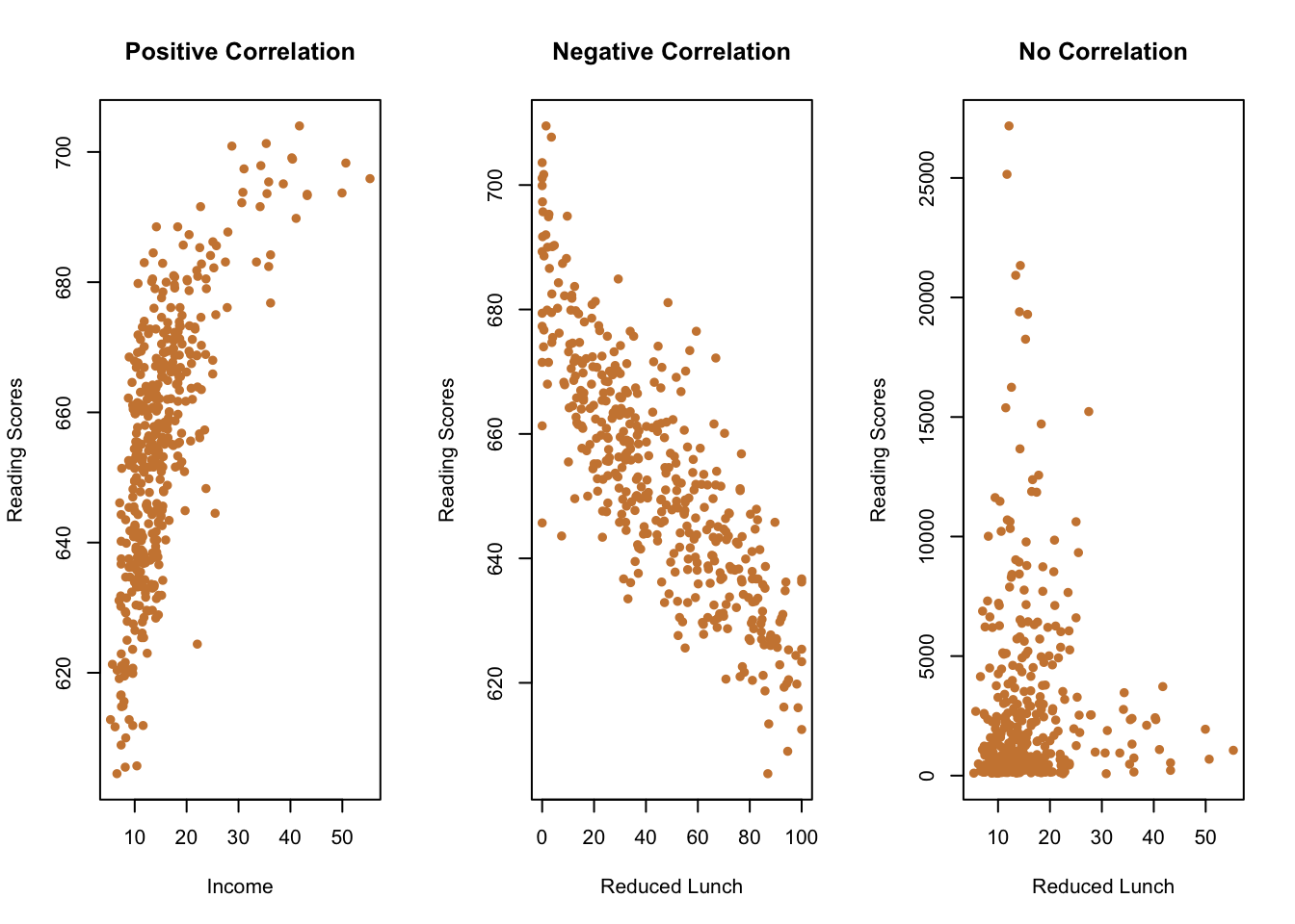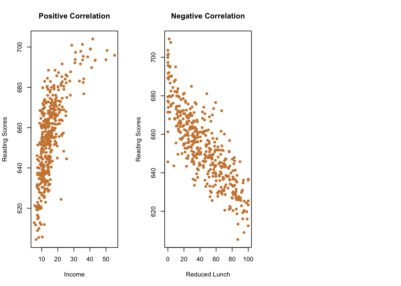 Okay, do you think schools that scored higher on the math test had more or fewer students that were receiving a free/reduced cost lunch (a common measure of poverty at a school)? You would probably predict they’d perform worse. So values that are higher for one variable (free lunches) would be lower for the other (math scores), and vice versa.