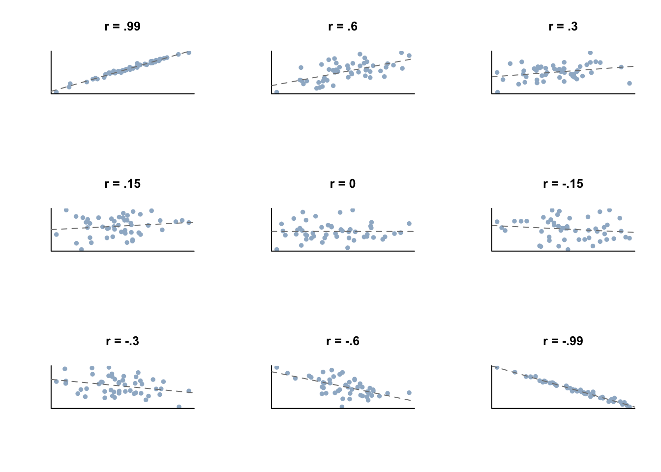Again, we rarely observe things that are perfectly correlated in the negative direction. But those are the two extremes, and we see every combination between those two limits. The chart below will (hopefully) help you to visualize different correlations and their relative strength.
