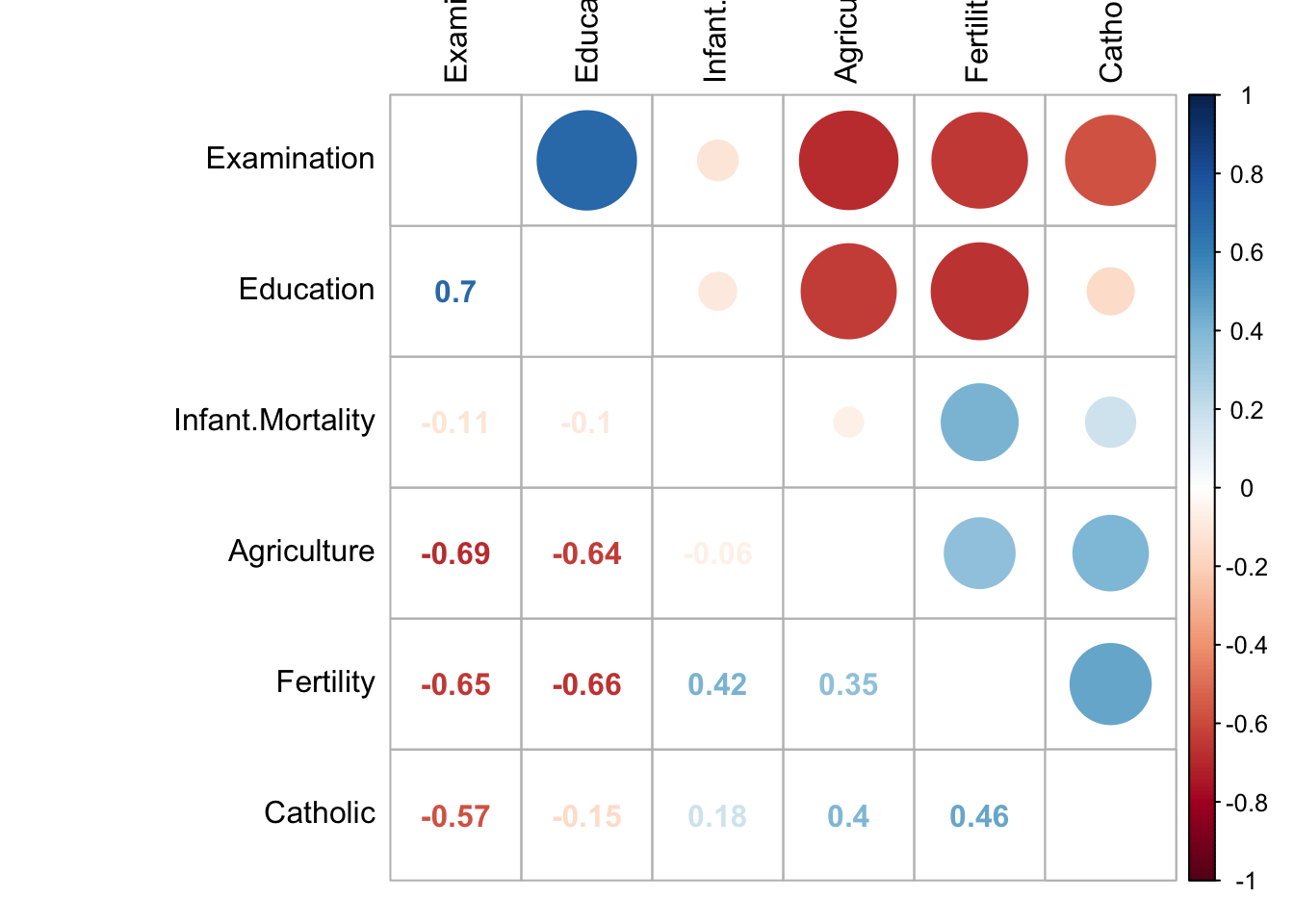 corrplot.mixed(cor(swiss), order="hclust", tl.col="black", tl.pos="lt")