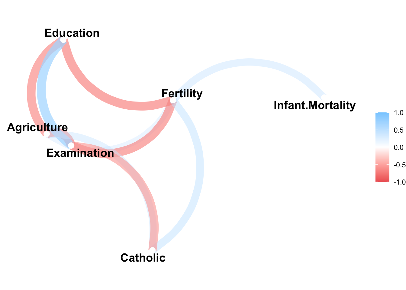 Not all of the variables in the data are displayed on that graph, only the ones with a correlation coefficient above the minimum set with the option min_cor. There I specified .35, so only those variables with a correlation above that figure are graphed. Similar to the first graph we made, negative correlations are displayed in red, and positive ones are in blue. Here there is a line between the names of different variables indicating that they are correlated. For instance, we can see that Infant.Mortality is correlated positively with Fertility because of the blue line, but Infant.Mortality is not correlated above .35 with Catholic because there is no line. It’s a minimalist way to display correlations, that again only emphasizes those variables that are associated above a certain point.