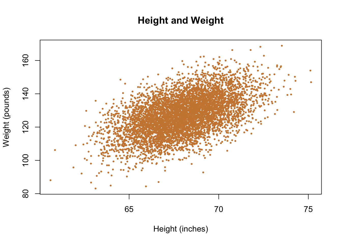 As height increases, weight increases too in general. Or more specifically, as the distance from the mean for height increases, the distance from the mean for weight increases too. I’ll give you the spell later, but calculating correlations in r just takes 3 letters.