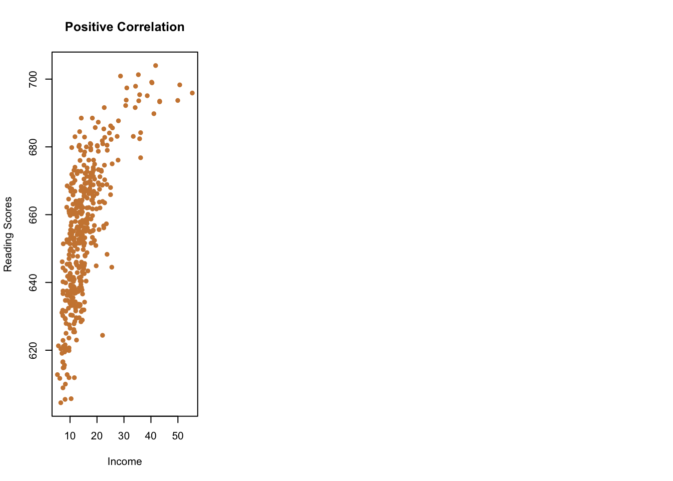 Remember earlier we described a positive correlation as being a situation where one thing goes up (increases) and the other goes up (increases) too. But goes up from what? What does it mean for income and test scores to both increase in tandem.