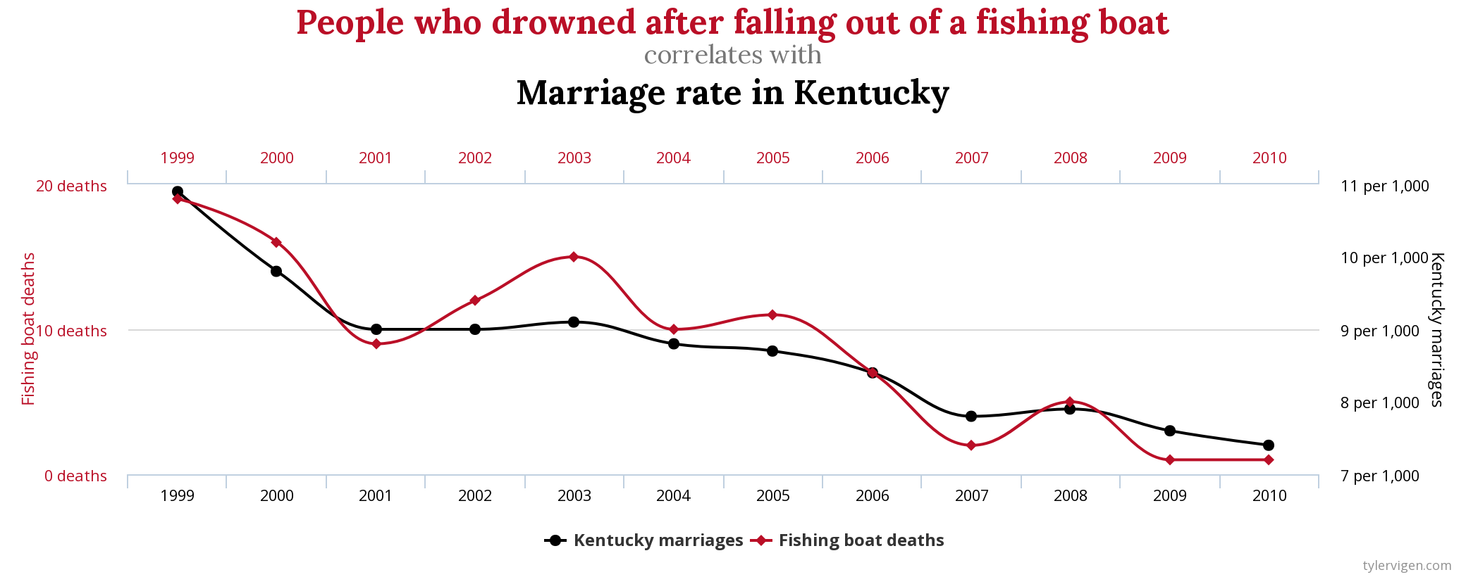 Those are all from the wonderful and wacky website of Tyler Vigen, where he’s investigated some of the weirder correlations that exist. Sometimes two things co-occur, and it’s just by random chance. We call those spurious correlations, for when two things correlate but there isn’t a causal relationship between them. Those are funny examples, but misunderstanding causation and correlation can have significant consequences. It is so critically important that a researcher think through any and every other explanation behind a correlation before declaring that one of the variables is causing the other one. It doesn’t not matter how strong the correlation is, it can be spurious if the two factors are not actually causing each other.
