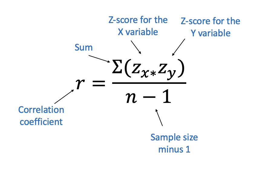 So that is the formula for calculating the correlation coefficient, which probably doesn’t make any sense right now. That’s fine, most mathematical formulas are Greek to me too. So we’ll break it down so you can understand exactly what all those different pieces are doing. The most important parts are the two z-scores on top.