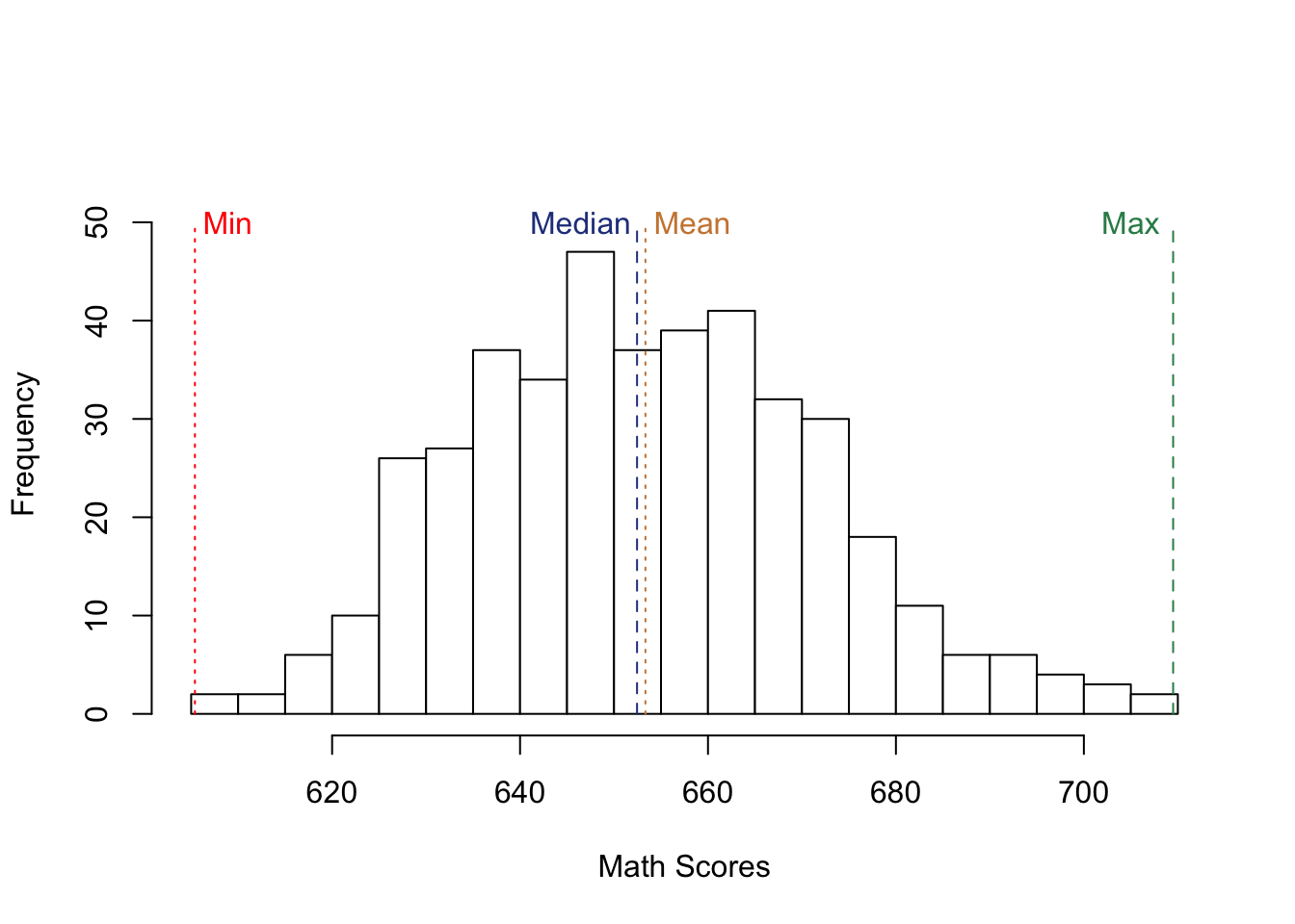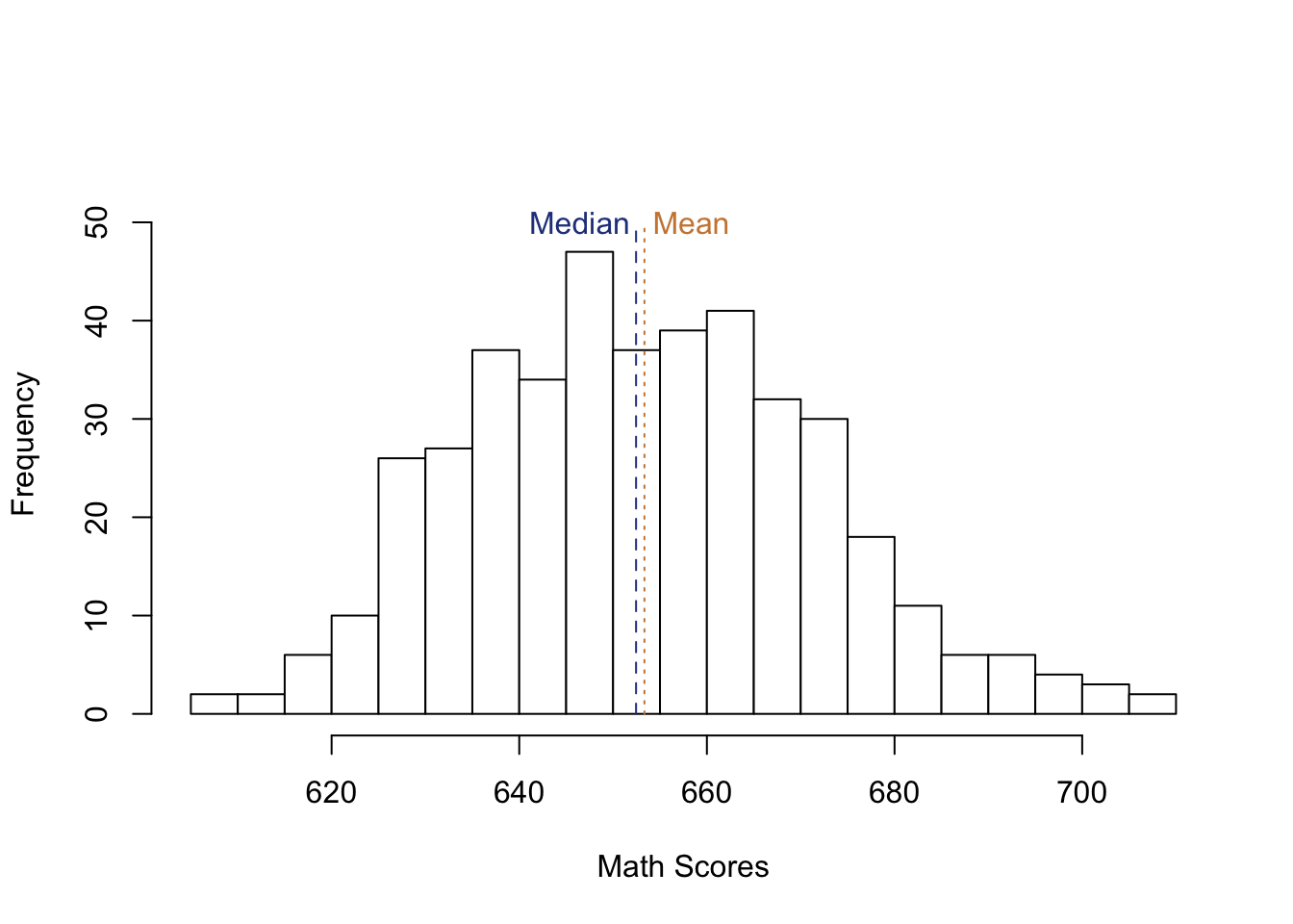 Take a look at that list again then, does 668.3 look high or low? It’s lower than the first number, but higher than the second and third. But I don’t want to take the time to compare my school to every other school individually. That would be exhausting just with the 420 schools that are in the state of California. Rather than doing 420 individual comparisons, let’s have R do some math for us.