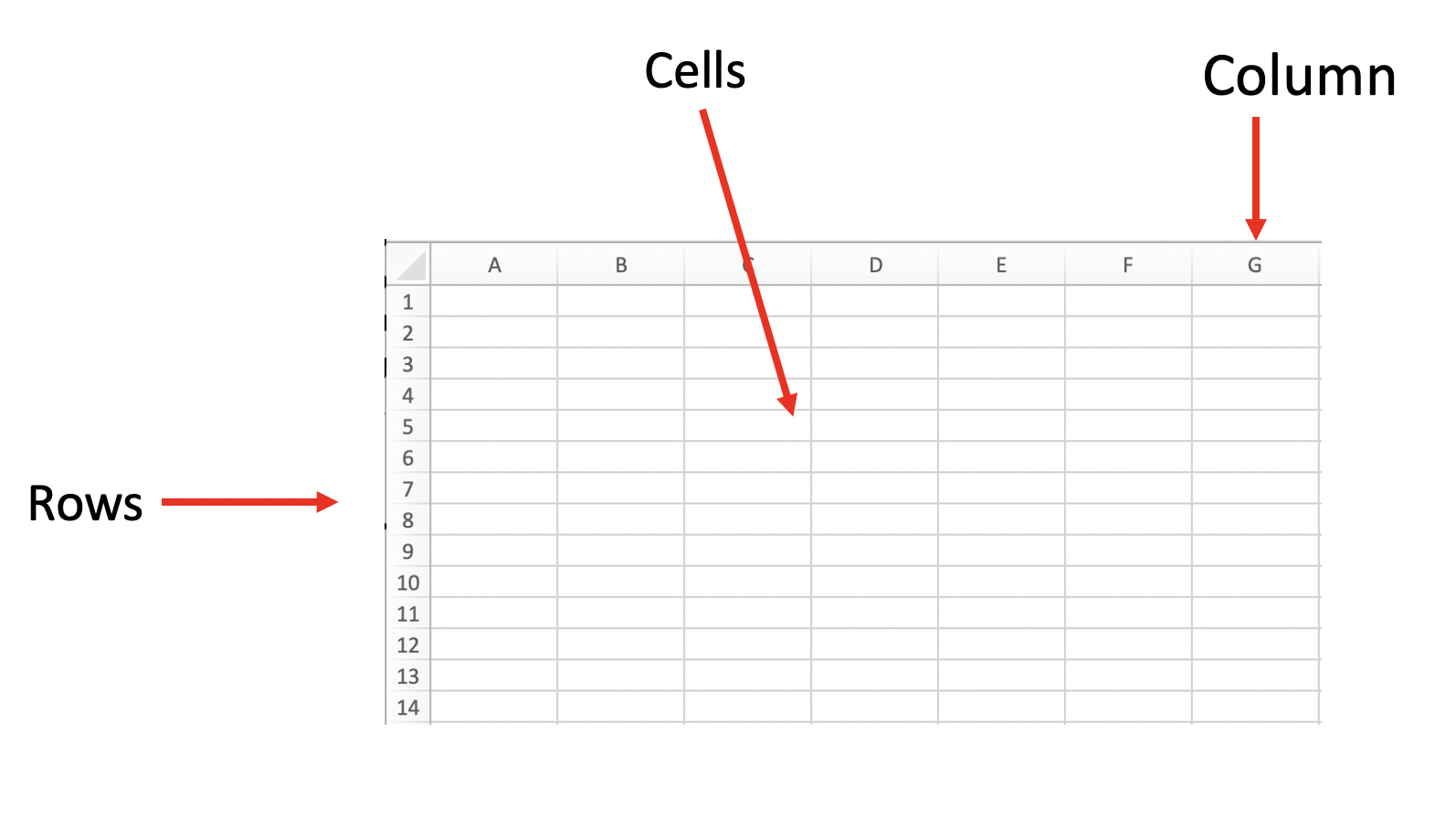 Data is made up of rows and columns. Rows run from side to side on the sheet, while columns go up and data. Each data point falls into a cell, which can be identified by the exact row and column it has in the data.