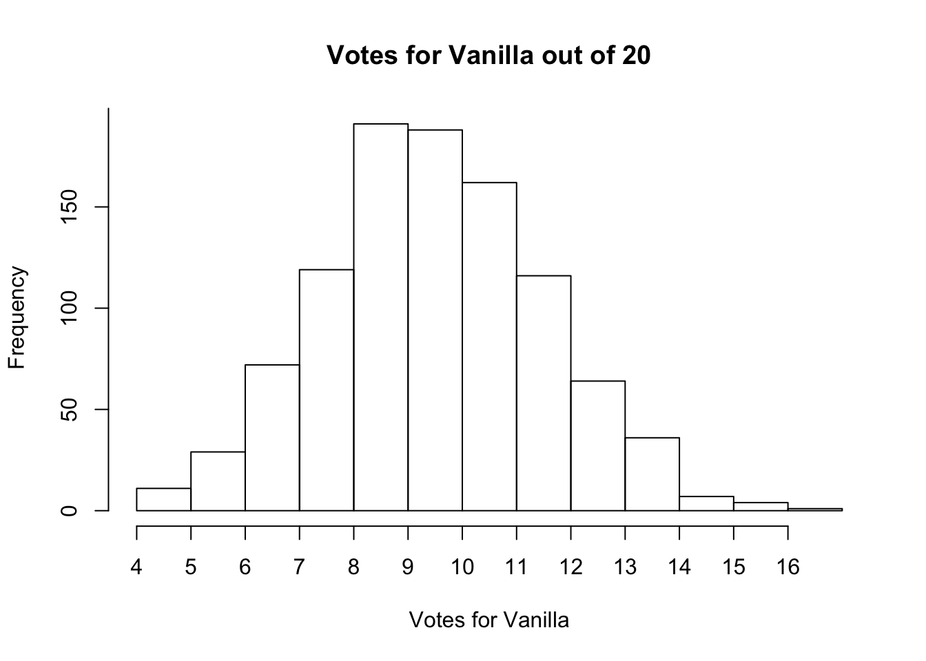 What if we did that exercise 1000 times, taking different random samples of 20 people? Let’s look at the total number of votes for vanilla below. And just to be clear, anyone that doesn’t vote for vanilla is then voting for chocolate, so we can see both how many people voted for vanilla and chocolate by just plotting one of the two flavors.