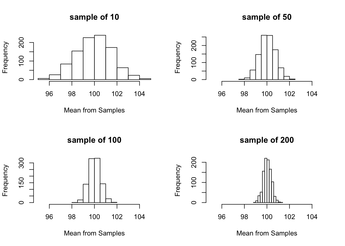 Let me demonstrate that below. Let’s imagine we have some data with a mean of 100 and a standard deviation of 5. Those are the characteristics of the population. Let’s take different size samples from that population and see how dispersed the data is.