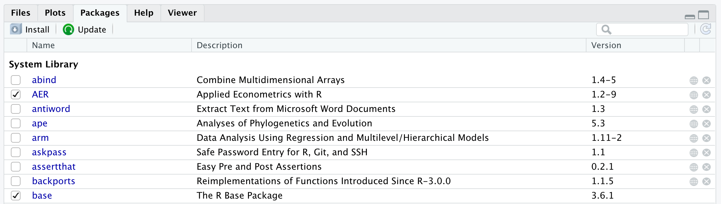 So there’s a manual way of checking whether a package is installed on your computer. On the bottom right portion of your screen, where a graph usually pops up, there is another tab for packages.